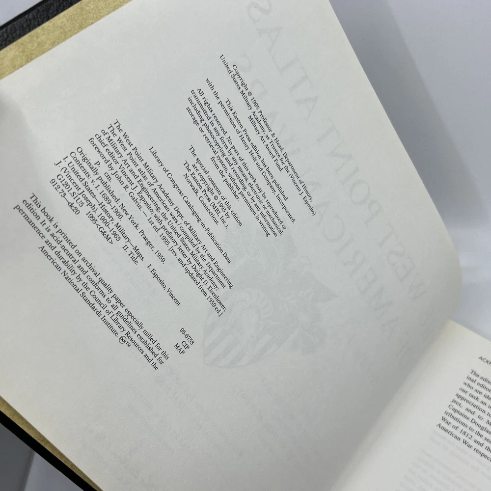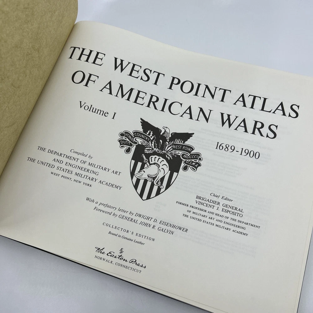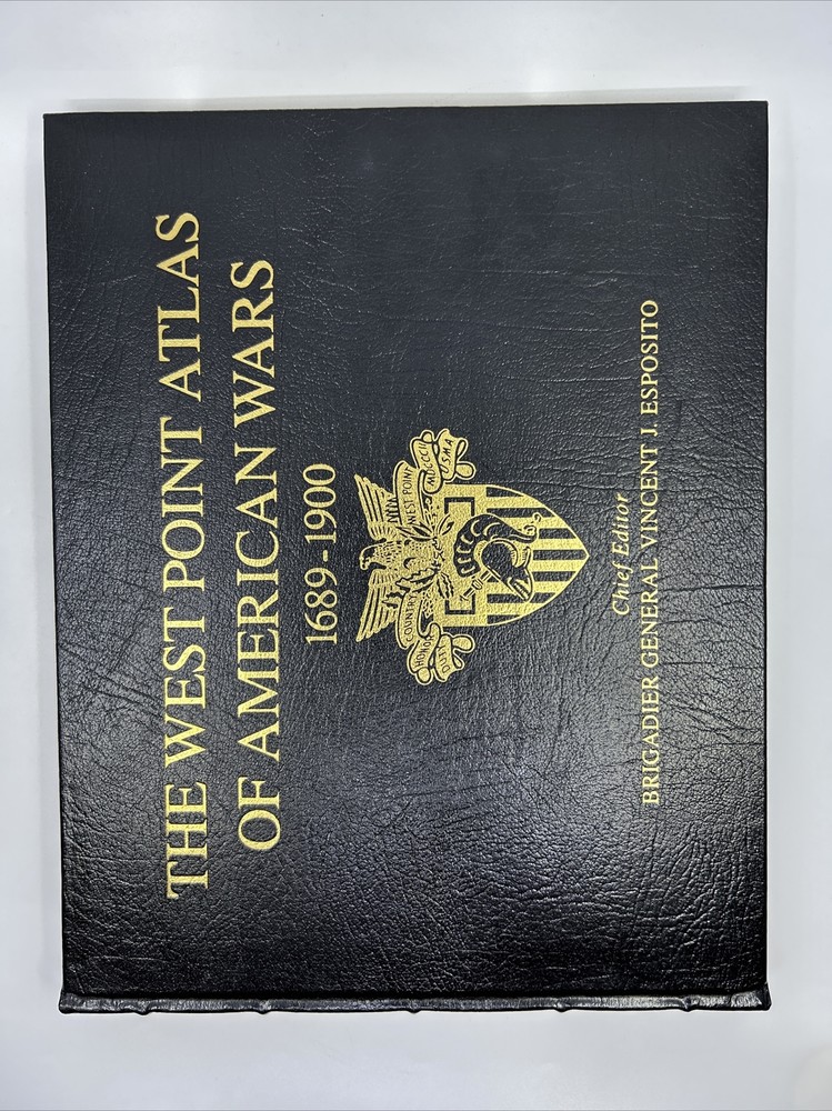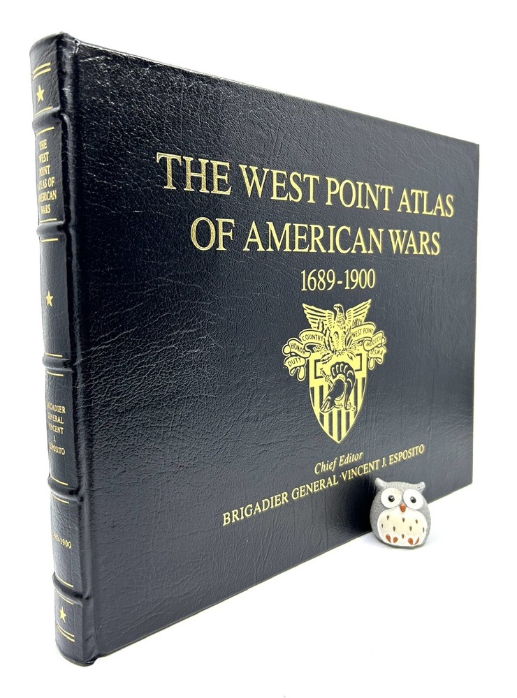 >>> GET IT NOW & ADD IT TO YOUR LIBRARY TODAY! <<< Leather-bound Easton Press/Henry Holt & Company collector's edition of The West Point Atlas Of American Wars 1689-1900, Vol I Chief Editor Brigadier General Vincent J. Esposito Condition – Good/Very Good; no attached bookplate/no embossed seal/no signatures or markings ; oversized & heavy volume; paper endsheets; some shelf wear/marks/scratches/spotting/flaking/rubbing to page gilt; some shelf wear/marks/nicks/rubbing/bumps to leather covers; loose blank bookplate laid in; may have some dust from storage; please see all photos for details - photos are part of description; from an adult only smoke & pet free household; owl not included Shipping – boxed USPS Media Mail; no international shipping (please do not ask) Payment – within two days from the listing's end (Best Offer acceptance) unless prior arrangements have been made No Returns/Sold 'As Is' – please contact me if you have any additional questions/issues or with requests for additional pictures >>> GET IT NOW & ADD IT TO YOUR LIBRARY TODAY! <<< *The only true First Editions (1 st Editions) from Easton Press you can be 100% certain about are books with “Signed First Edition " gilt-stamped on the leather spine or “Signed First Edition " printed on the title page and/or on the signature page. It is impossible to tell if any other Easton Press book is a first edition or first printing. Please keep that in mind and if not sure ask sellers for photos proving their claim. **Easton Press does not provide the actual print date in their books. For "Year Printed" the copyright date is listed (oftentimes from the original Heritage Press editions, rights to which were sold to Easton Press), which may or may not indicate an accurate range for manufacture of the book. ***Please note that Easton Press’s term Collector’s Edition is not synonymous with Limited Edition (LE). The only true Limited Editions from Easton Press are copies hand-numbered on the limitation page (i.e. ‘Number 1 of 1200’ or ‘This edition is strictly limited to a quantity of 1200 copies of which this is number 1’). Please keep that in mind and if not sure ask sellers to prove their claim.