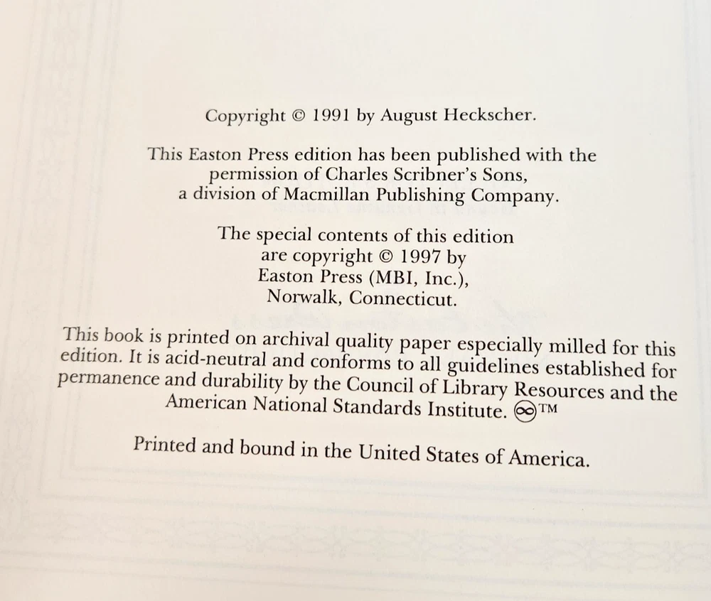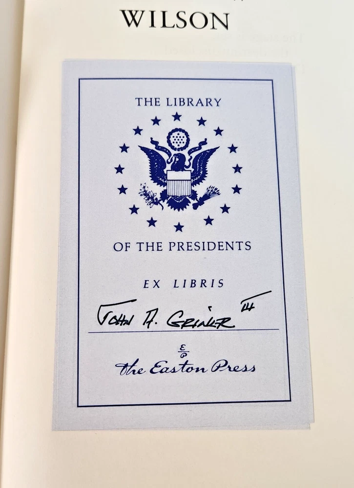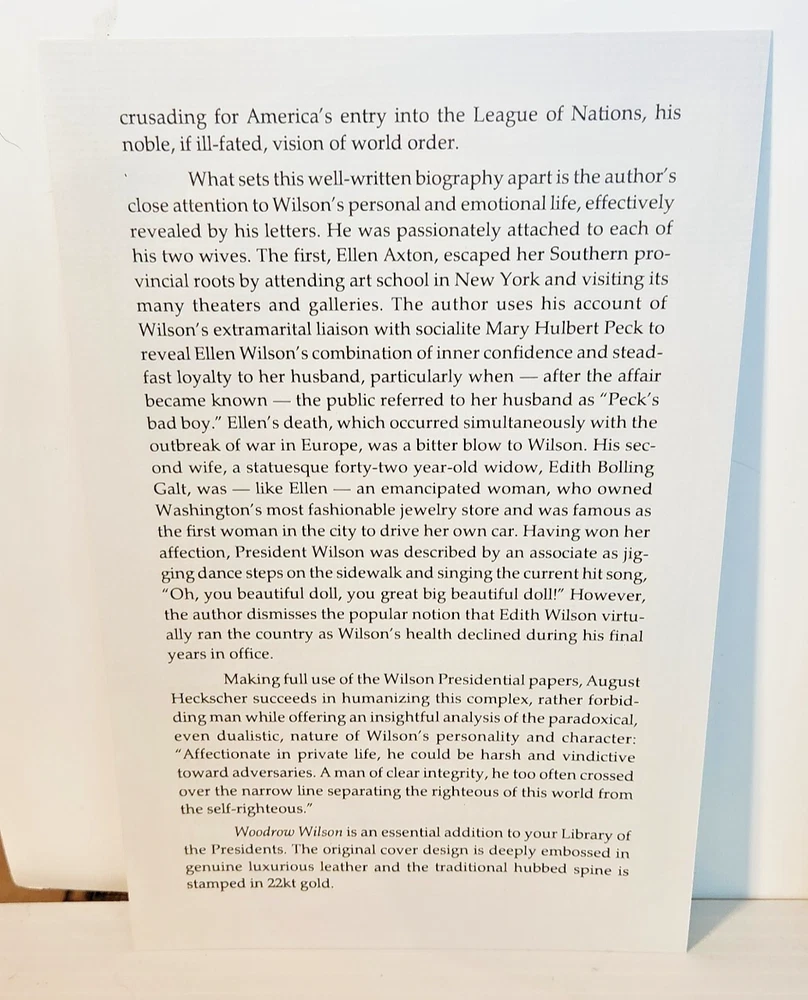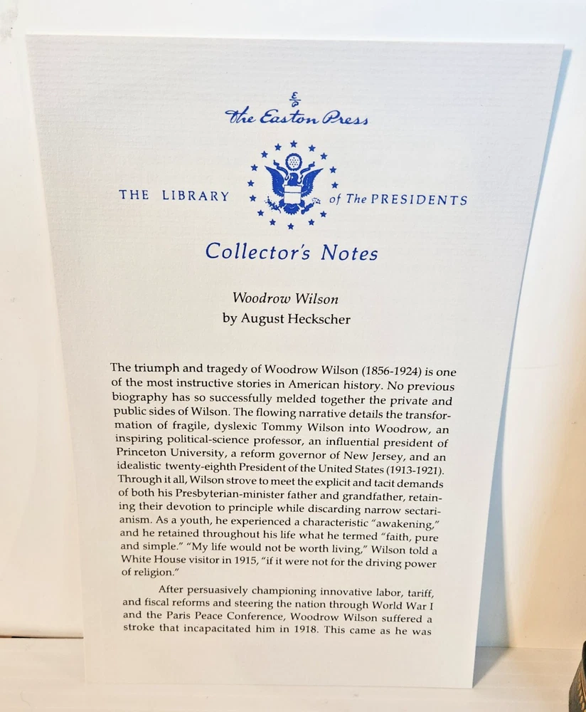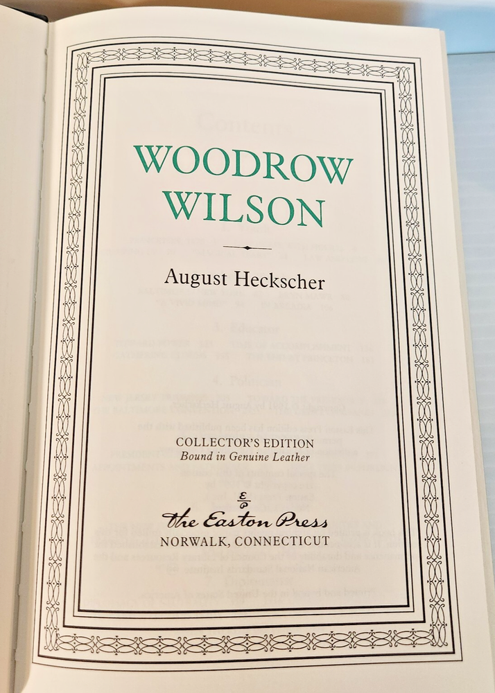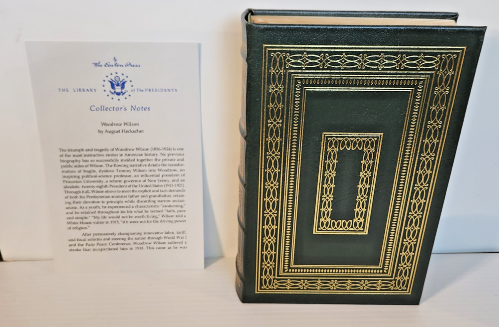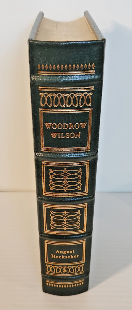 EASTON PRESS Woodrow Wilson August Heckscher 1997 Leather-bound Presidents Collector's Edition Series 22kt gold accents deeply inlaid on the "hubbed" spine. Heavy duty binding boards enhance the book’s durability. Superbly printed on acid-neutral paper that lasts for generations. Sewn pages — not just glued like ordinary books. Handsome moiré end pages and a satin-ribbon page marker. Gilded page ends. Printed and bound in the USA using imported materials. Superb craftsmanship and commitment to quality. Condition – Very Good; ex Libris attached bookplate and a few tiny marks on the opening side gilding; may have some dust from storage. Smoke free history.