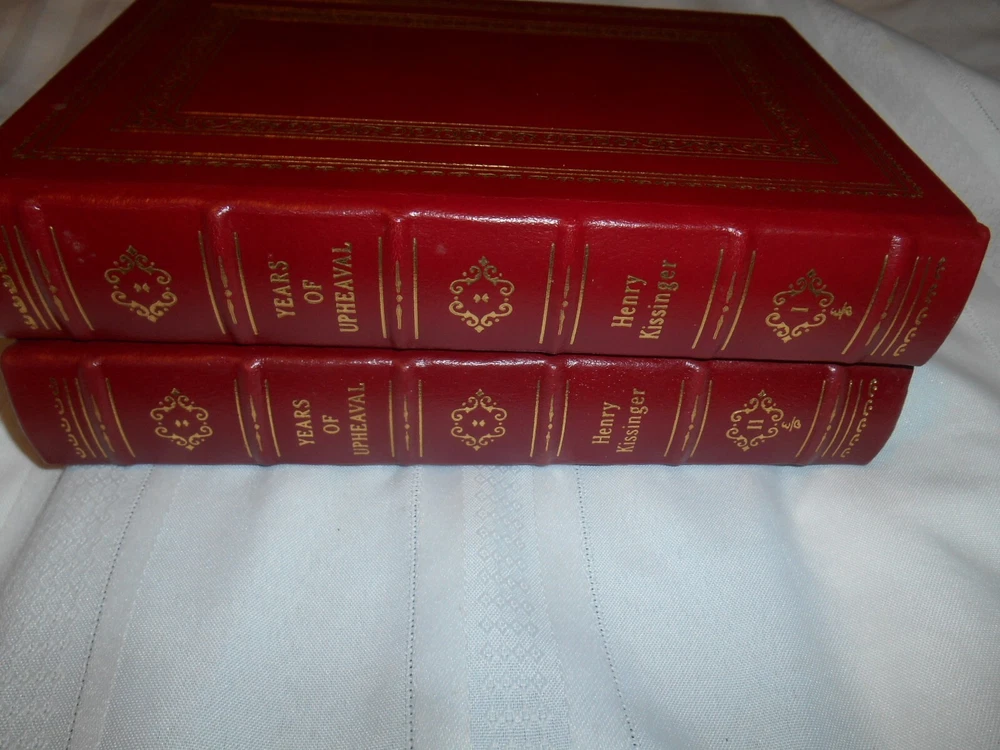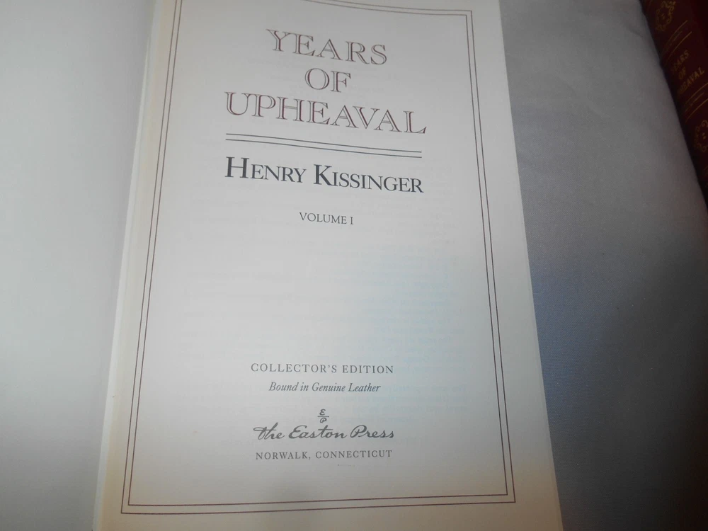 Here is an Easton Press book titled "Years of Upheaval" by Henry Kissinger. This is a 2 volume set. These books are leather bound. These appear to be in excellent condition. I am not a professional book grader so if you have any questions, please feel free to email me. Please check out my other Easton Press books I have on ebay. I acquired 50 + Easton Press books from an estate. Many are signed and/or sealed. I will be listing these over the next several months so keep checking in.