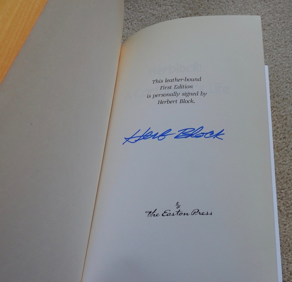 [zipedit] ; BOOK TITLE : A Cartoonist's Life AUTHOR : Herbert Block (SIGNED BY AUTHOR) PUBLISHER/COPYRIGHT : c1993, The Easton Press ILLUSTRATIONS : b/w lis in text DIMENSIONS : approx 6 1/4" x 9 1/2" x 372 pages CONDITION : Leather bound hardback book, very good condition. SIGNED BY AUTHOR. All edges gilt. Moire end papers. Self bookmark. Interior clean and unmarked by former owner. CONTENTS : autobiography of cartoonist Herblock Check out my other items as I frequently list related items in the same week! PLEASE CHECK MY EBAY STORE....I PLACE MANY ITEMS IN THE STORE, WHICH DOES NOT BENEFIT FROM EBAY SEARCH, SO YOU MAY FIND A TREASURE THERE! Thanks for shopping with me! Please see photos below. c37