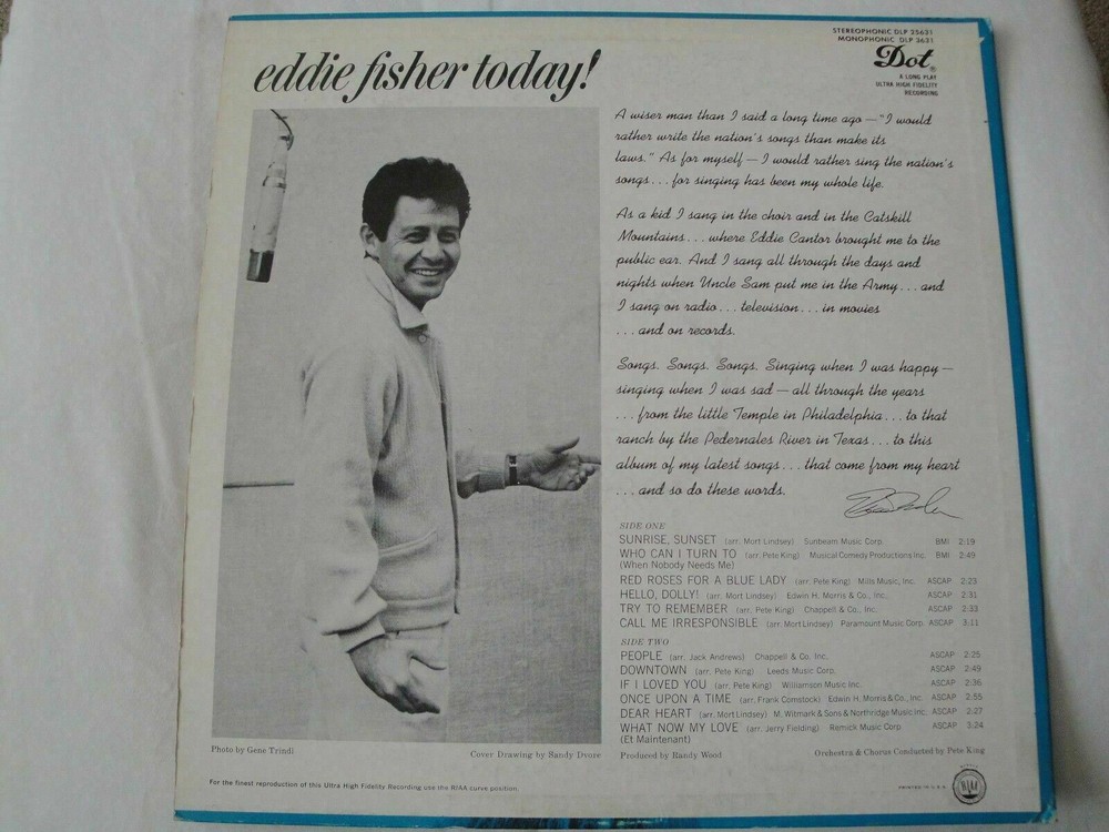 EDDIE FISHER TODAY! VINYL LP. VG+ ON VINYL AND COVER. THE RECORD LOOKS AND SOUNDS VERY GOOD. THE COVER HAS TIGHT SEAMS AND LOOKS GOOD, LIGHT SHELF WEAR(SEE PHOTOS). OVERALL NICE ALBUM. ORIGINAL 1965 DOT RECORDS DLP 25631, STEREO. PLEASE SEE PHOTOS I'VE TAKEN TO TRY TO GIVE YOU A BETTER FEEL OF WHAT YOU’RE BIDDING ON. PHOTOS SHOULD SHOW A COMPLETE PLAYLIST AND OTHER PERTINENT INFORMATION. IF YOU HAVE ANY OTHER QUESTIONS, PLEASE DON'T HESITATE TO ASK! THIS IS ONE OF MANY CLASSIC/RARE ALBUMS I'LL BE PUTTING UP FOR SALE IN THE NEXT WEEKS. THANKS FOR YOUR INTEREST!! 10157 Listing and template services provided by inkFrog