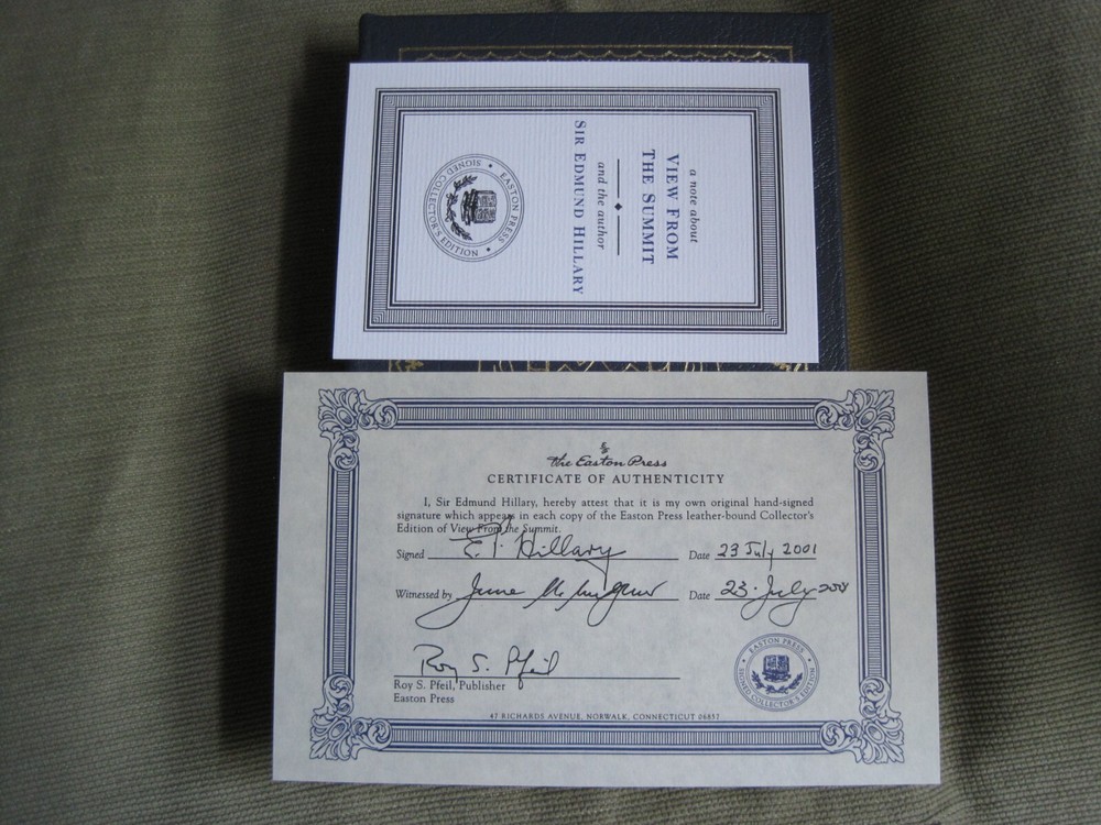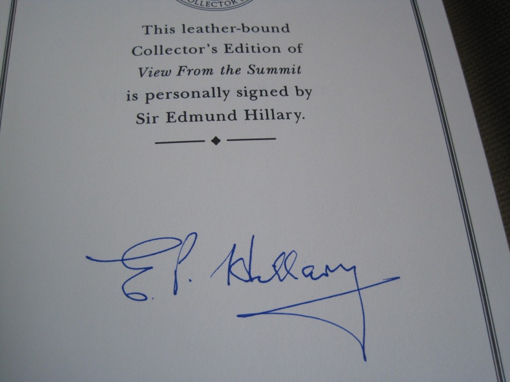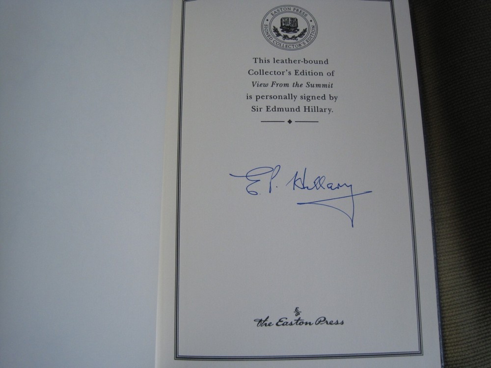 This is a leather bound signed collector's edition of Sir Edmund Hillary's fascinating story of the mankind's first ascent on Mount Everest - "VIEW FROM THE SUMMIT" . A true national hero in his native New Zealand, and a respected voice all over the world, Sir Ed passed away in January 2008. The book is new, unread and in great condition (see images) and it is signed by Sir Ed Hillary on the limitation page. It includes the signed and dated certificate of authenticity, and the publisher's note card. Easton Press books are the golden standard in the publishing industry, highly collectible and lasting generations. Easton Press Full Genuine Leather Dubbed Spine Accented Wit 22 kt. Real Gold Satin Ribbon Page Marker Distinctive Cover Design Gilded Page Edges To Protect Against Humidity High Quality Acid - Free paper Smyth-Sewn Pages Silk-Moire Endleaves I combine multiple items for savings on shipping charges. I ship worldwide. Please ask about international shipping charges and/or different shipping options. Please check out my other auctions for several rare signed books for sale. Thank you!