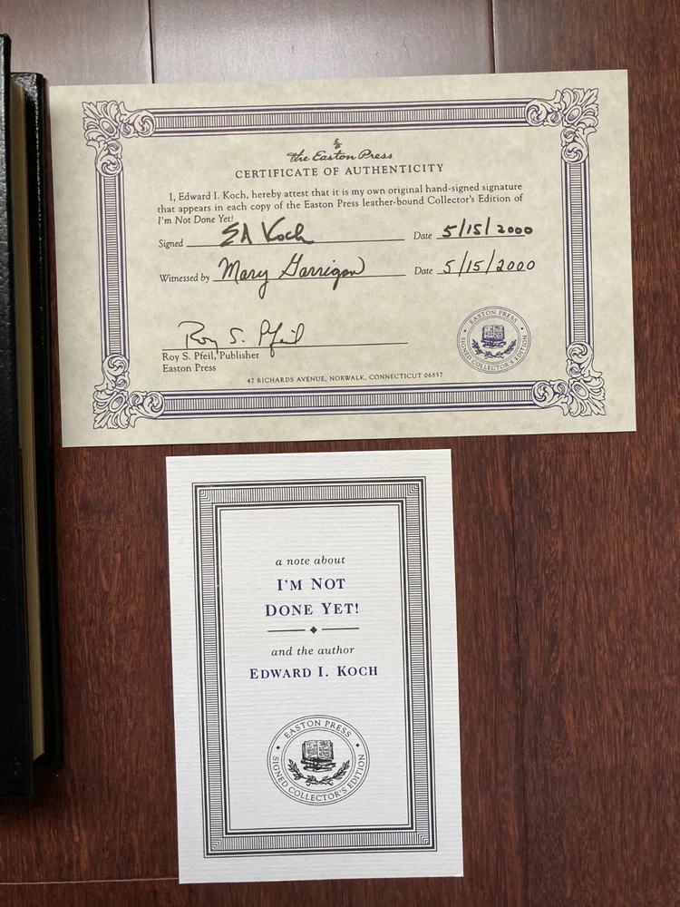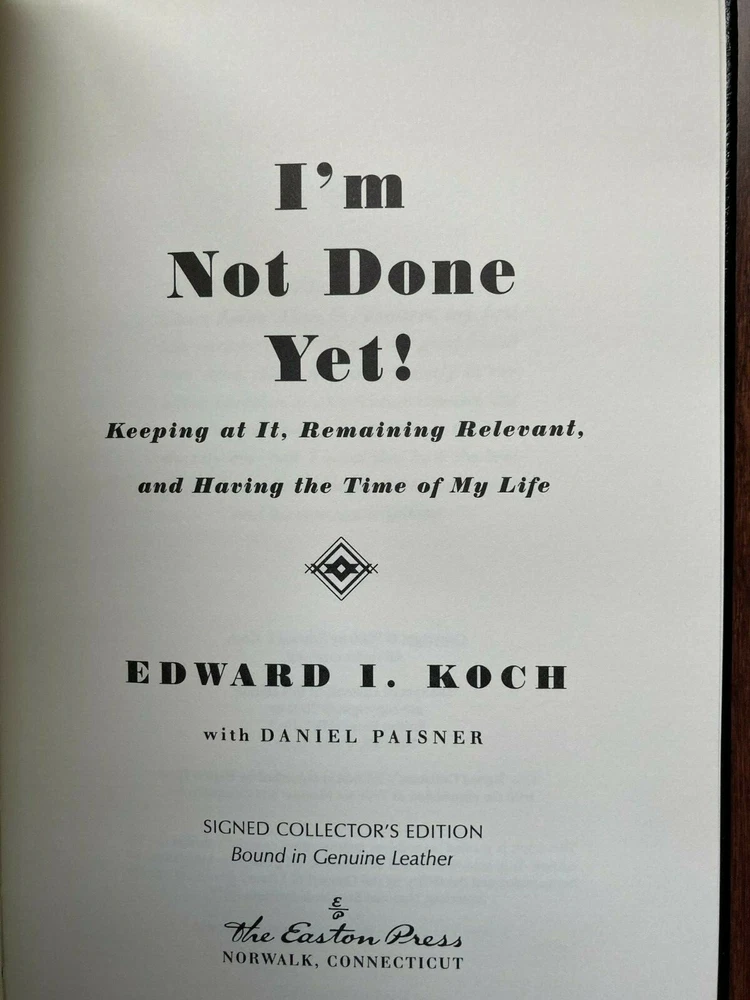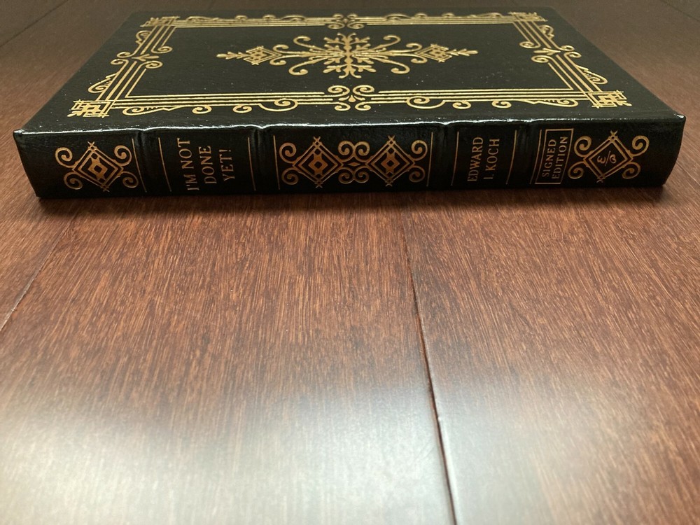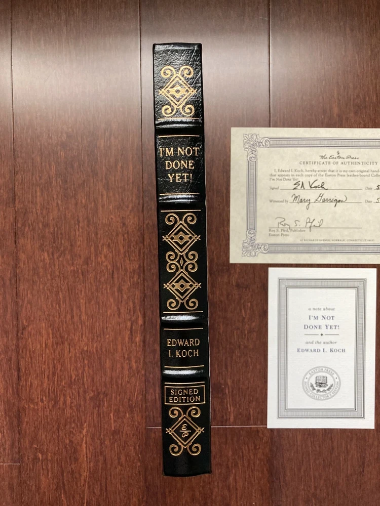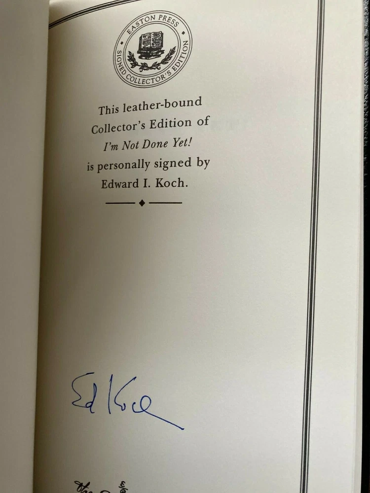 EDWARD I. KOCH ~ I'M NOT DONE YET ~ SIGNED EDITION COA .…...Easton Press, Norwalk CT...…..First edition First print...….2000...……..Bound in black glove-soft genuine leather...…..accented in 22kt gold...…..beautiful pristine unread condition...…..Collector's Edition...…….196[pp]……….hubbed spines.....end sheets of moire fabric with a silk ribbon page marker….9" x 6". All of my books are bubble wrapped and shipped securely in a box with packing materials. I am glad to combine purchases to minimize shipping expenses. Standard mail is USPS Media Mail. Expedited and international shipping are also available upon request.