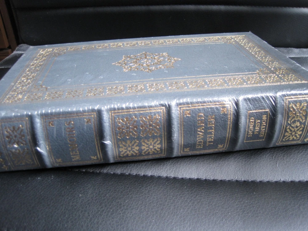 This is a leather bound signed first edition of Dr. Edward Teller's best-selling autobiography - "Memoirs: A Twentieth Century Journey in Science and Politics", a fascinating book written by the famous theoretical physicist, also well known as "the father of the Hydrogen Bomb". Edward Teller is perhaps best known for his belief in freedom through strong defense. But this extraordinary memoir at last reveals the man behind the headlines--passionate and humorous, devoted and loyal. Never before has Teller told his story as fully as he does here. We learn his true position on everything from the bombing of Japan to the pursuit of weapons research in the post-war years. In clear and compelling prose, Teller chronicles the people and events that shaped him as a scientist, beginning with his early love of music and math, and continuing with his study of quantum physics under Werner Heisenberg. He also describes his relationships with some of the century's greatest minds--Einstein, Bohr, Fermi, Szilard, von Neumann--and offers an honest assessment of the development of the atomic and hydrogen bombs, the founding of Lawrence Livermore Laboratory, and his complicated relationship with J. Robert Oppenheimer. Rich and humanizing, this candid memoir describes the events that led Edward Teller to be honored or abhorred, and provides a fascinating perspective on the ability of a single individual to affect the course of history. The book is in unread and in great condition, still sealed in the original plastic packaging. Signed by the world famous scientist on the limitation page, this is one of only 1225 signed and numbered copies ever printed. It also has the signed and dated certificate of authenticity and the publisher's note card sealed inside. Easton Press books are the golden standard in the publishing industry, highly collectible and lasting generations. Easton Press Full Genuine Leather Dubbed Spine Accented Wit 22 kt. Real Gold Satin Ribbon Page Marker Distinctive Cover Design Gilded Page Edges To Protect Against Humidity High Quality Acid - Free paper Smyth-Sewn Pages Silk-Moire Endleaves I combine multiple items for savings on shipping charges. I ship worldwide. Please ask about international shipping charges and/or different shipping options. Please check out my other auctions for several rare signed books for sale. Thank you!