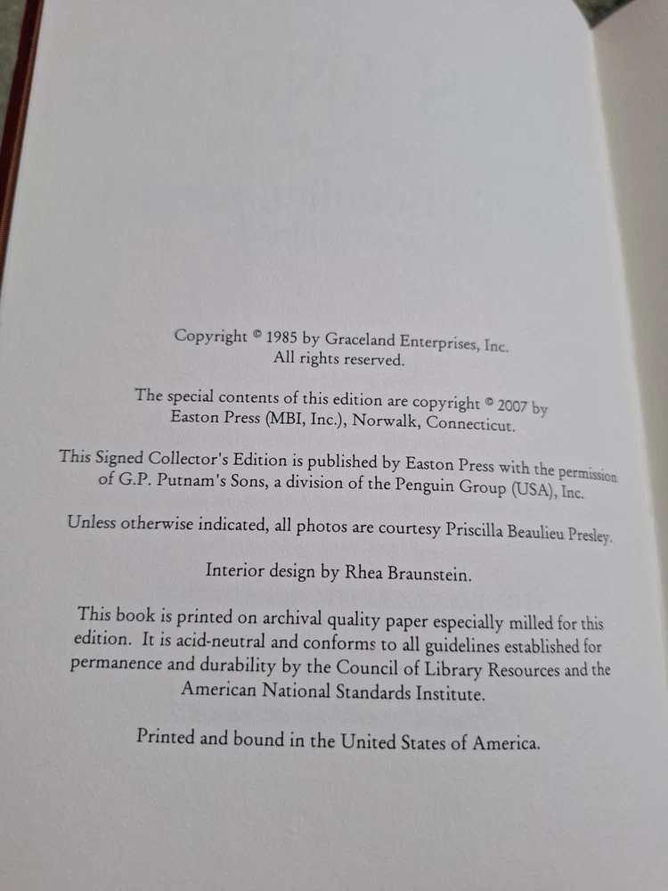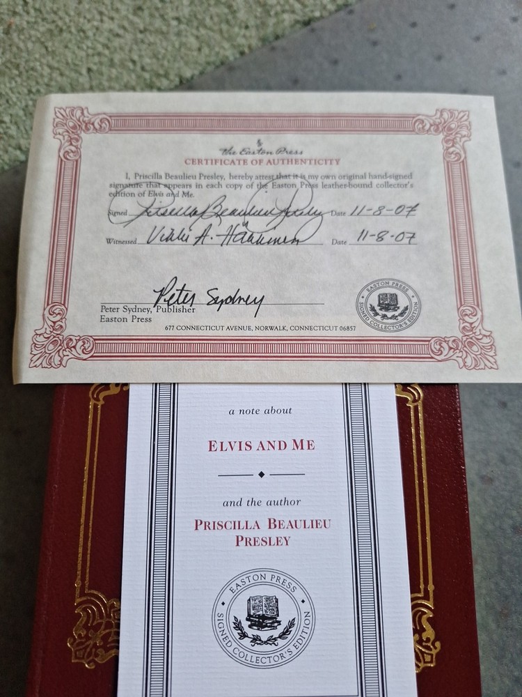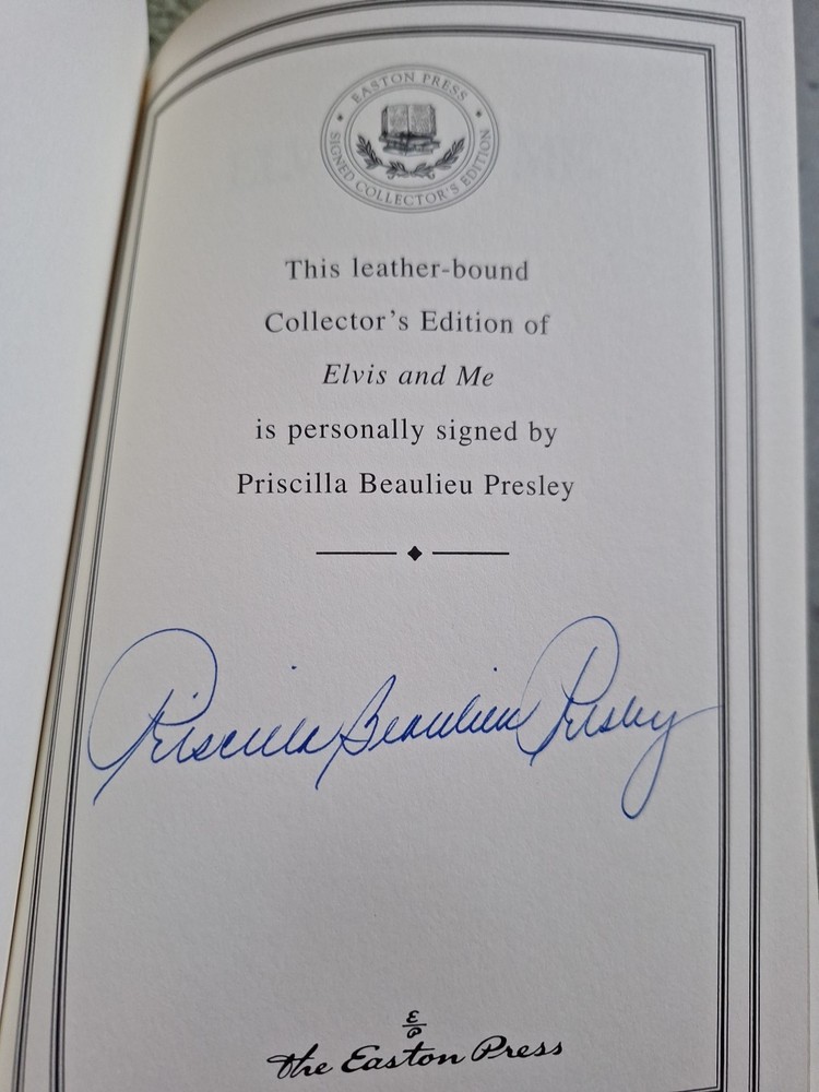 UP FOR BID WE HAVE A BEAUTIFUL LEATHER BOUND SIGNED EDITION OF "ELVIS AND ME" BY PRISCILLA PRESLEY. PUBLISHED BY THE EASTON PRESS IN 1985. COMES WITH A COA ALSO SIGNED BY MRS. PRESLEY FROM THE EASTON PRESS. ANY QUESTIONS PLEASE ASK, THANKS FOR LOOKING. JIM