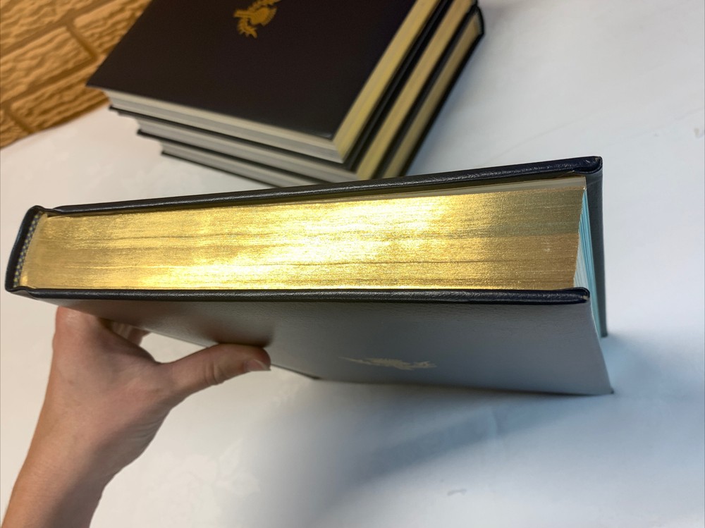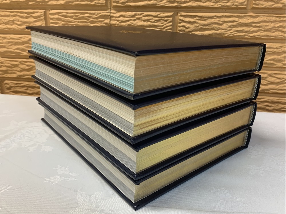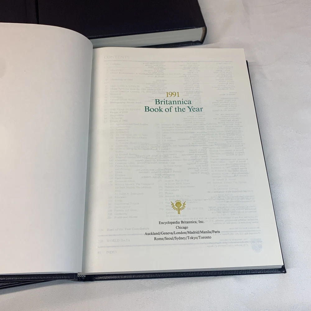 ENCYCLOPEDIA BRITANNICA ANNUAL WORLD DATA BOOK OF THE YEAR LEATHER Lot of 4: 1988, 1989, 1990, 1991 Top gold page edging. Tear/wear on cover - see pictures. Also, there is a name written on inside cover.