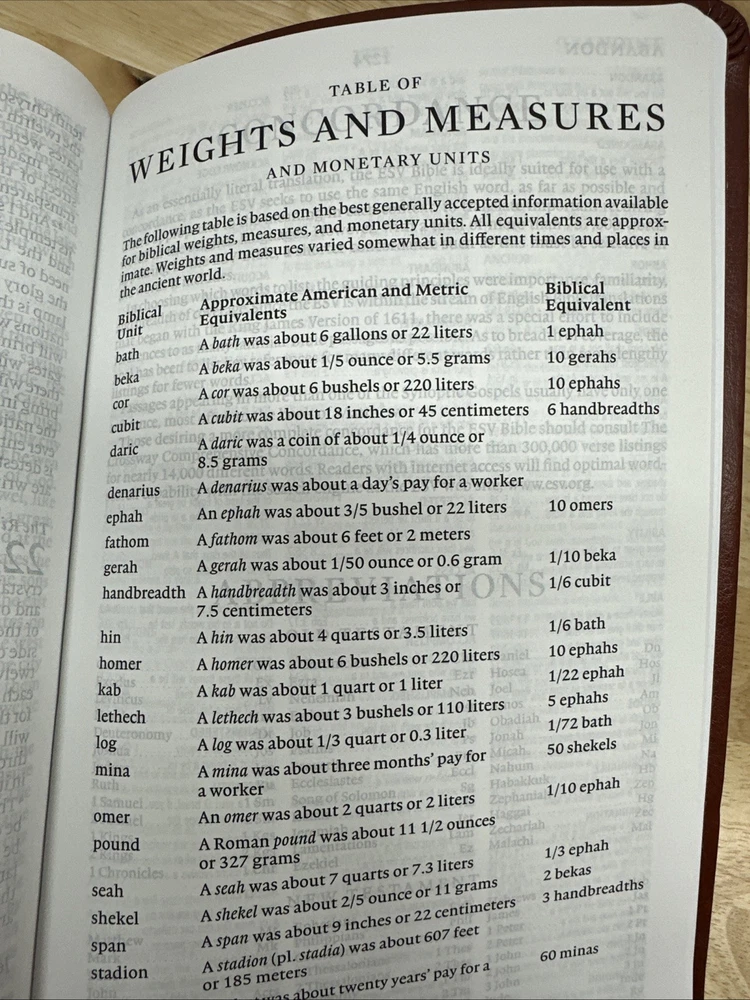 This is a brand new ESV Bible. It is the large print thinline edition. It has a "Weights & Measurements" and "Concordance" in the back. Please see pics for details and beauty.