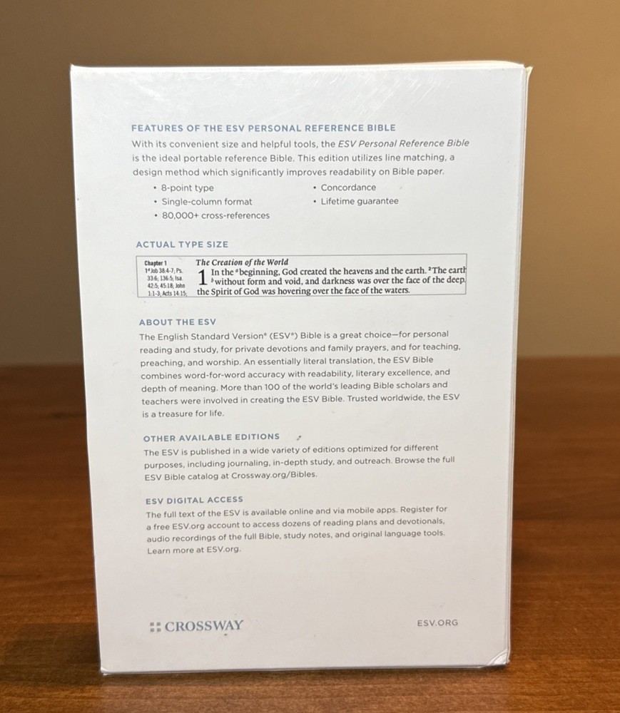 Love this ESV Bible! The TruTone cover in Quiet Forest is beautiful and feels great in hand. The single-column layout with line-matched text makes reading smooth and easy. Compact yet packed with cross-references, it’s perfect for study or daily reading. The imitation leather is durable, and the ornament design adds a nice touch. Highly recommend for anyone wanting a portable, high-quality Bible!
