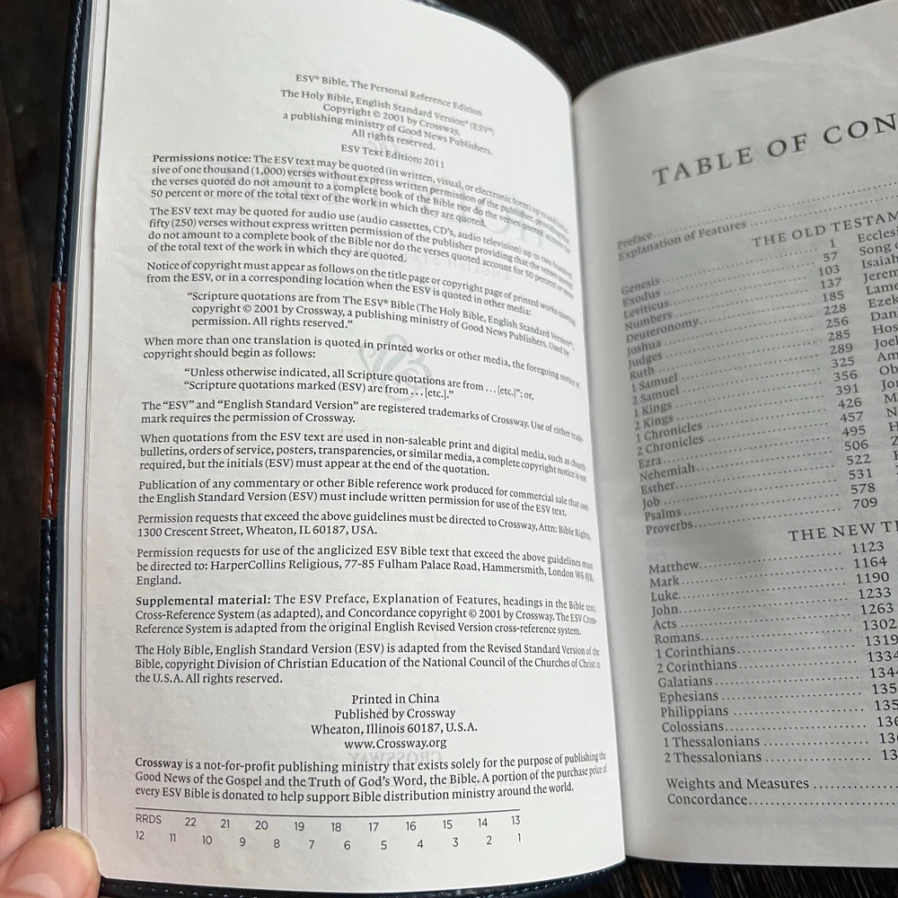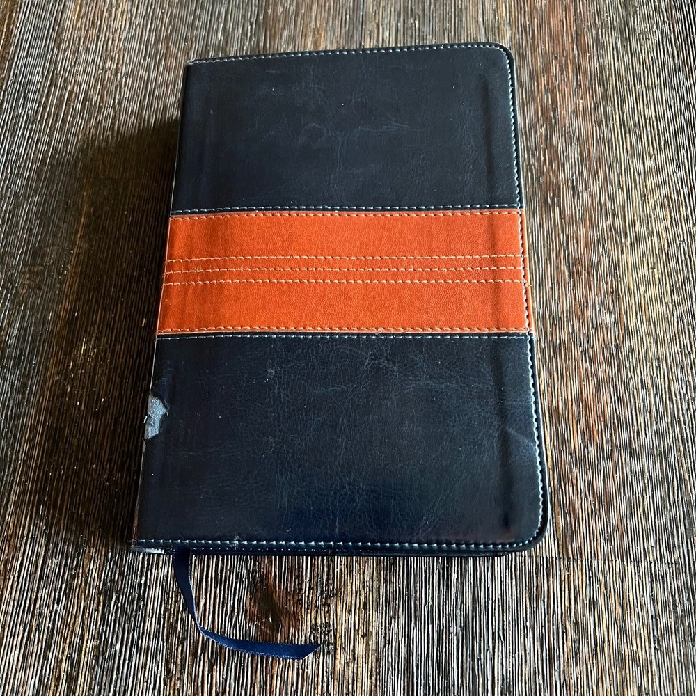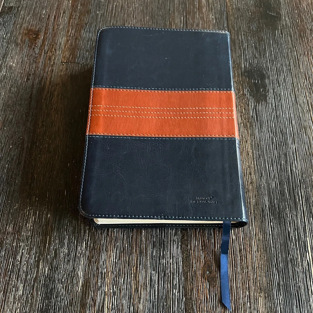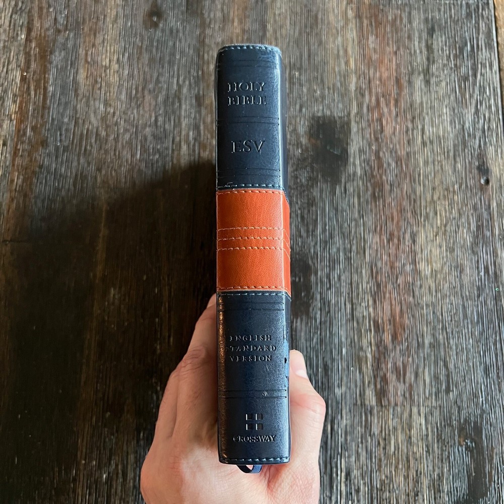 ESV Personal Reference Bible (TruTone, Navy/Chestnut, Trail Design) Imitation leather Bible Size: approximately 7.75 inches x approximately 5.25 inches x approximately 1.25 inches Good condition. The Presentation page has some writing; some has been blacked out with marker. The rest of the pages are free of markings and highlighting. The front cover has a small area on the left edge (along spine) where some of the cover has been lifted off (there was a sticker there and when I removed it, some came off-- see pictures). The covers also have some light wear. The gold on the edges of the pages has some light scratching. See pictures for more details. Copyright information -- Crossway, 2011 If you have any questions, please let me know. Thanks for looking!