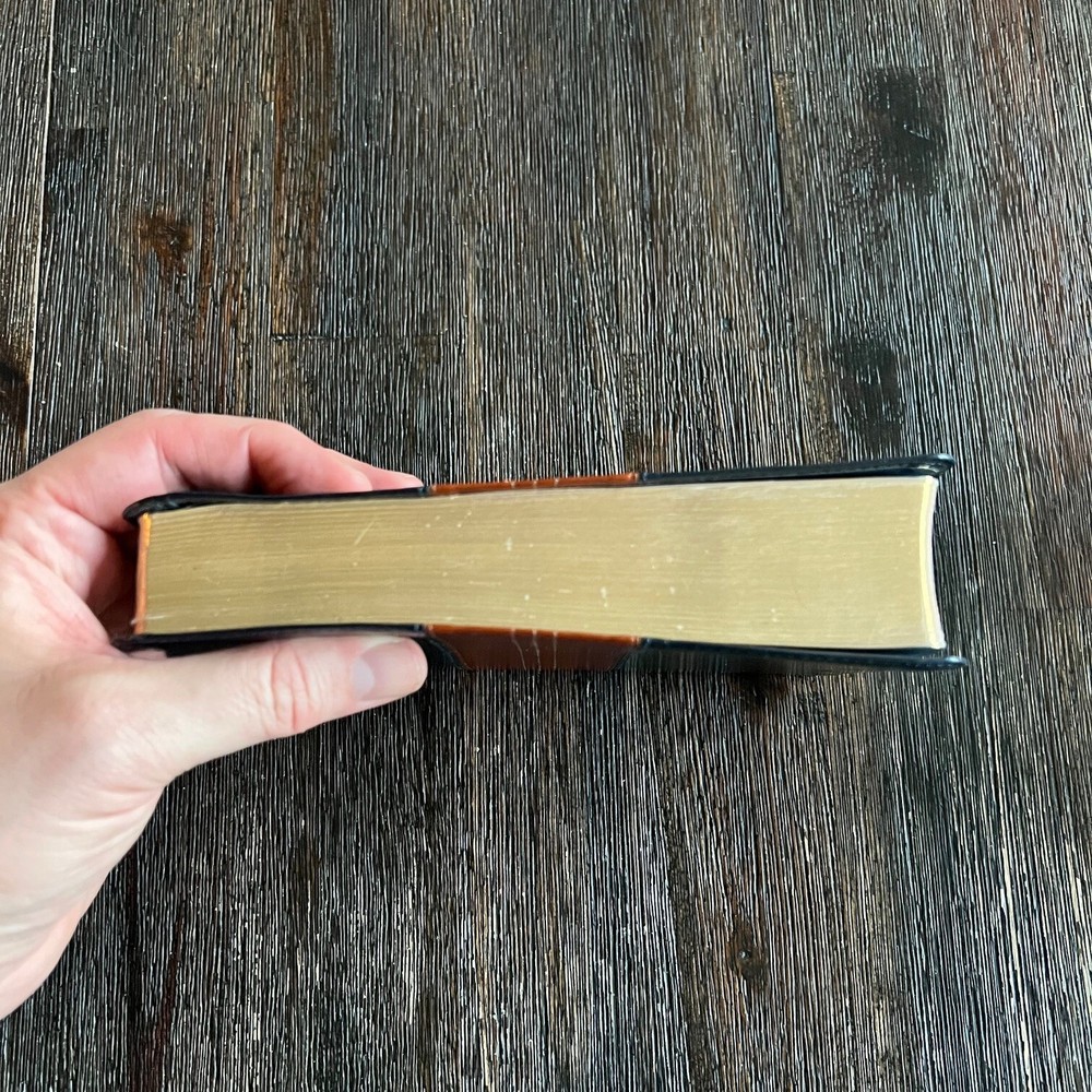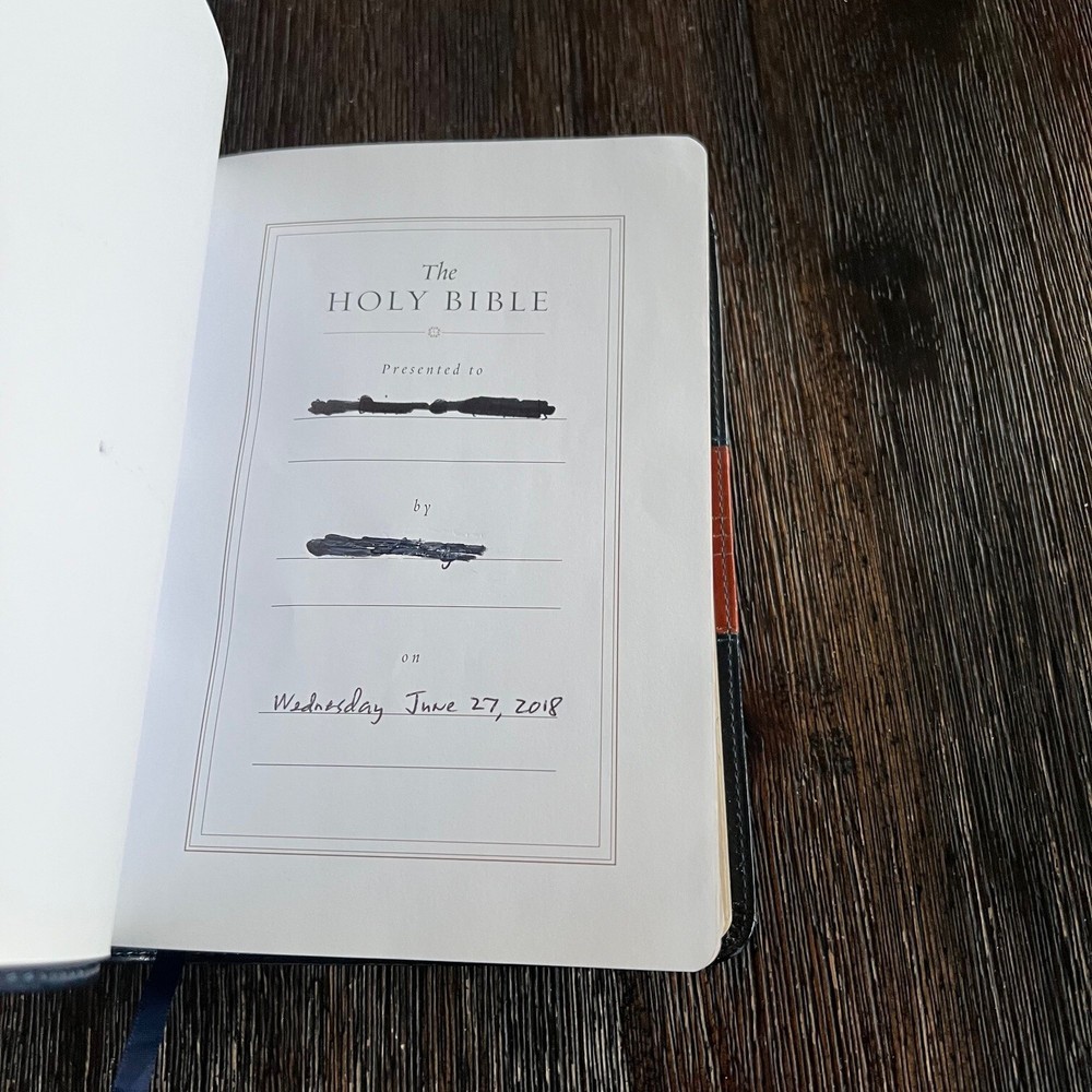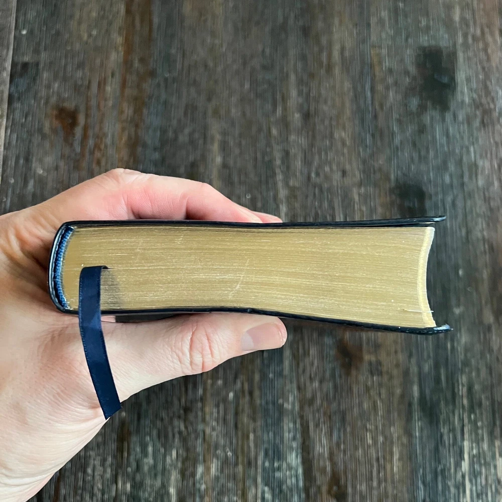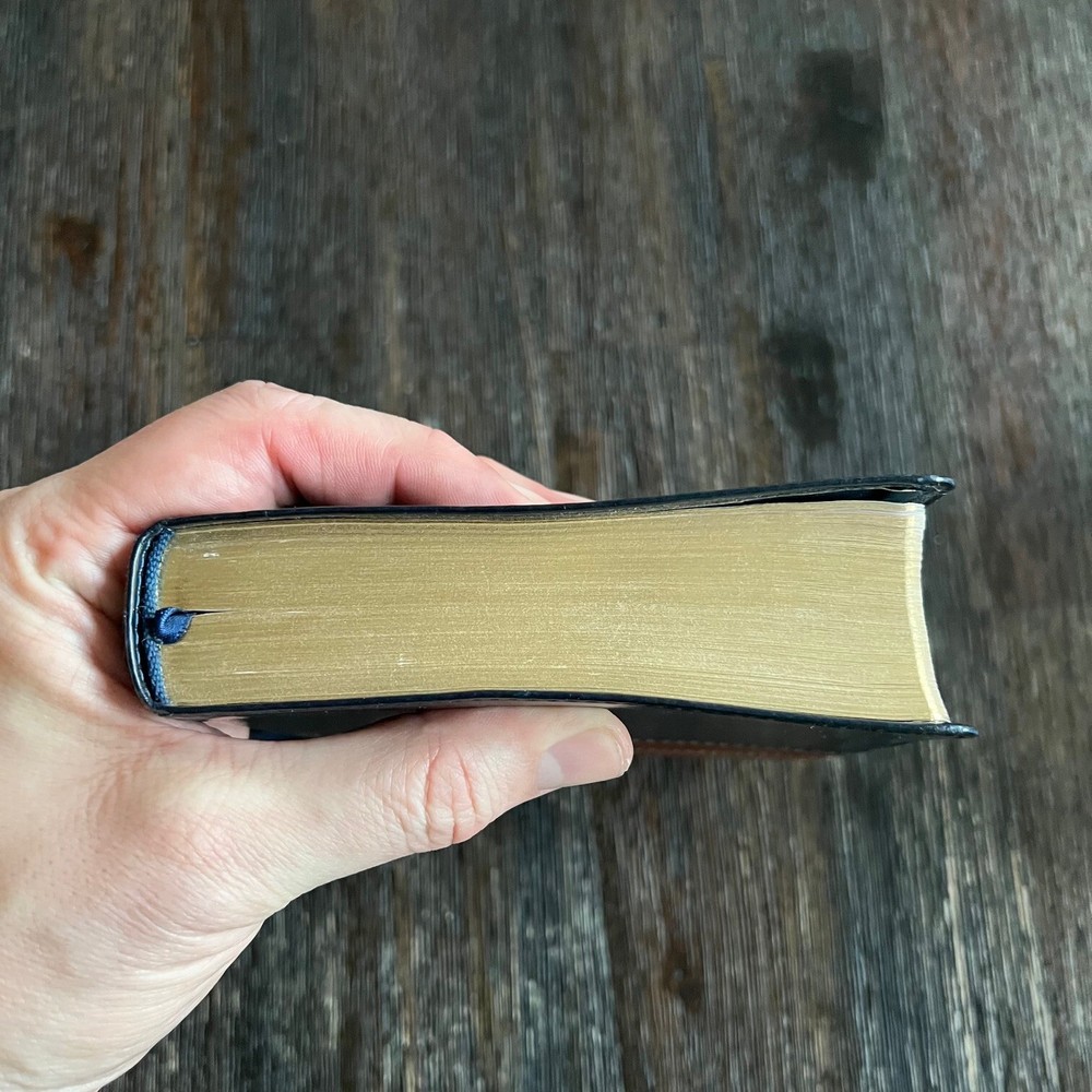 ESV Personal Reference Bible (TruTone, Navy/Chestnut, Trail Design) Imitation leather Bible Size: approximately 7.75 inches x approximately 5.25 inches x approximately 1.25 inches Good condition. The Presentation page has some writing; some has been blacked out with marker. The rest of the pages are free of markings and highlighting. The front cover has a small area on the left edge (along spine) where some of the cover has been lifted off (there was a sticker there and when I removed it, some came off-- see pictures). The covers also have some light wear. The gold on the edges of the pages has some light scratching. See pictures for more details. Copyright information -- Crossway, 2011 If you have any questions, please let me know. Thanks for looking!