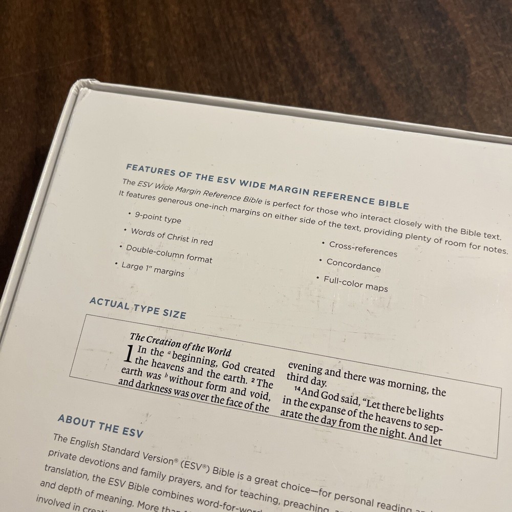 | Synopsis | The ESV Wide Margin Reference Bible is perfect for those who interact closely with the Bible text. It features generous, 1-inch margins on either side of the text, providing plenty of room for writing., The ESV Wide Margin Reference Bibleis perfect for those who interact closely with the Bible text. It features generous one-inch margins on either side of the text, providing plenty of room for notes., The ESV Wide Margin Reference Bible is perfect for those who interact closely with the Bible text. It features generous one-inch margins on either side of the text, providing plenty of room for personal note-taking. Other features include a concordance, full-color maps, and cross-references located in the corner of each page. This edition is ideal for all who want to record notes, thoughts, or prayers in their Bible. Wide Margins: Features 1" margins Red Letter: Words of Christ in red Quality Materials: Features smyth-sewn binding, a ribbon marker, gilding, and TruTone and leather covers designed to last Additional Content: Concordance, The ESV Wide Margin Reference Bibleis perfect for those who interact closely with the Bible text. It features generous one-inch margins on either side of the text, providing plenty of room for personal note-taking. Other features include a concordance, full-color maps, and cross-references located in the corner of each page. This edition is ideal for all who want to record notes, thoughts, or prayers in their Bible. Wide Margins:Features 1" margins Red Letter:Words of Christ in red Quality Materials:Features smyth-sewn binding, a ribbon marker, gilding, and TruTone and leather covers designed to last Additional Content:Concordance, The ESV Wide Margin Reference Bible is perfect for those who interact closely with the Bible text. It features generous, 1-inch margins on either side of the text, providing plenty of room for personal note-taking. Other features include a concordance, full-color maps, and cross-references located in the corner of each page. This edition is ideal for all who want to record notes, thoughts, or prayers in their Bible. Features: Size: 6.5" x 9.25" 9-point Lexicon type 1,440 pages Words of Christ in red Double-column, paragraph format 1" margins Cross-references Concordance Full-color maps 2 ribbon markers Smyth-sewn binding Lifetime guarantee Packaging: clamshell box |