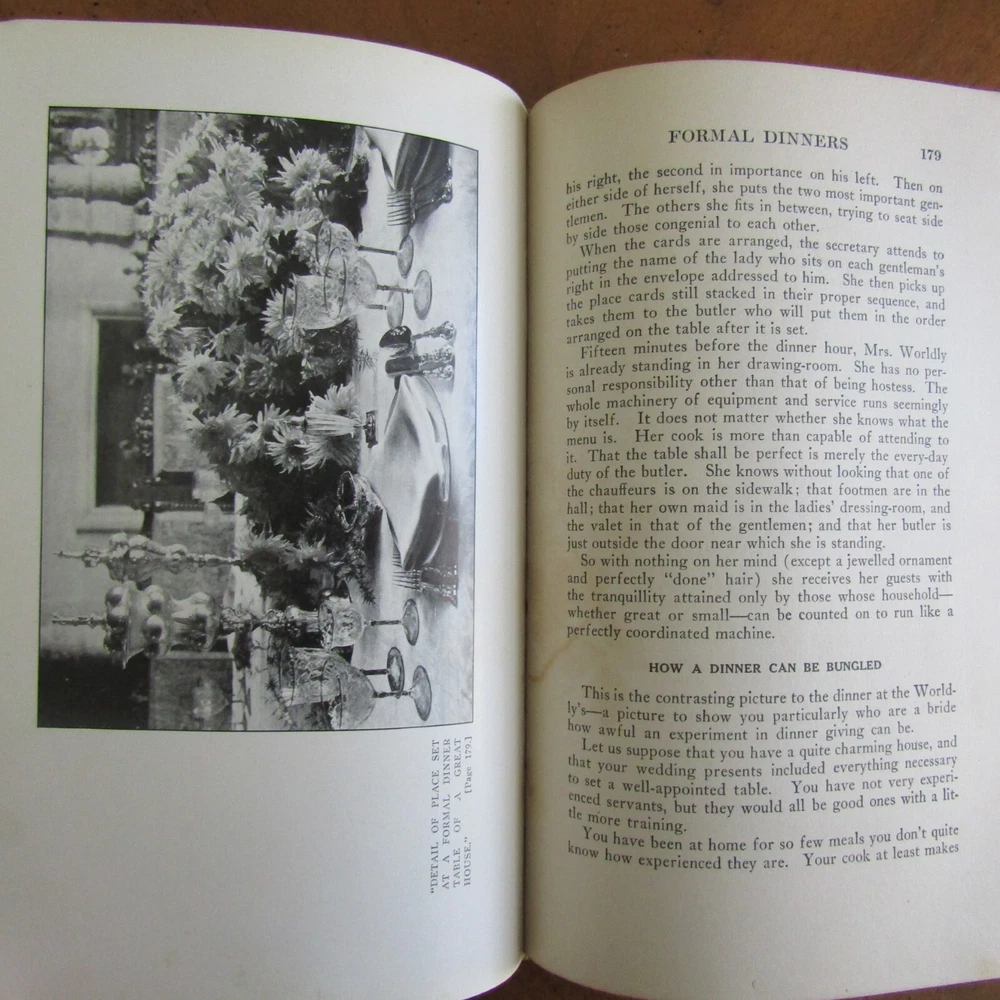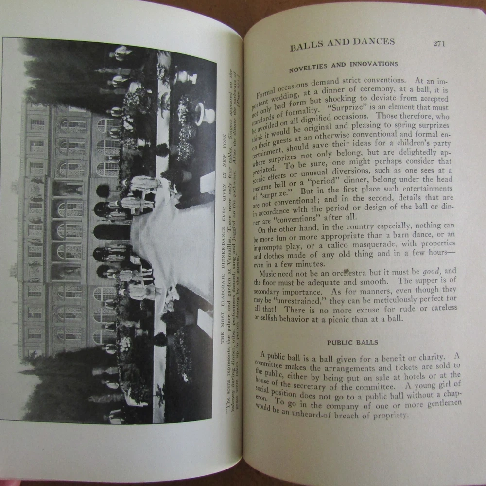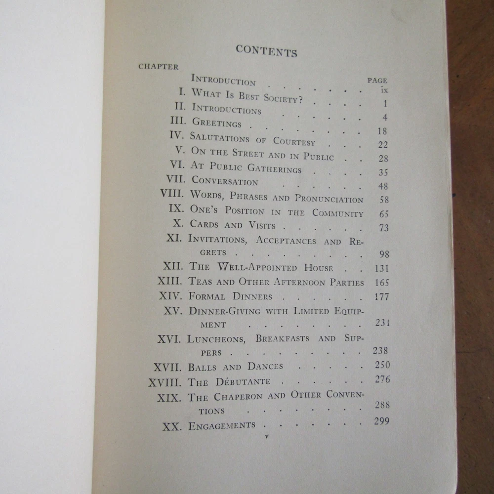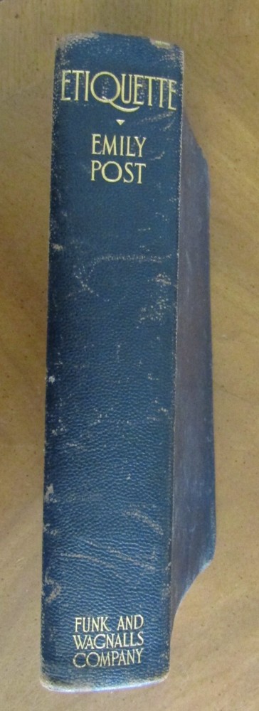 ETIQUETTE In society, in business, in politics, and at home by Emily Post was published by Funk & Wagnalls in 1922. The definitive text on manners and correct presentations in social affairs, covering a wide variety of gatherings, 627 pages with index. Fifteen b/w plate photographs scattered. "Second Edition published September 1922" on the copyright page. Gilt page edges. Binding is dark blue leather with gilt lettering at the spine. 6" x 9." Good condition. Plate photograph opposite p. 132 has a 4" horizontal tear at the upper section. A few pages have darkened imprint from dried leaves or flowers put in pages. Front binding corners, the leather separates from the paper underneath. Light foxing to binding. Wear at extremities and spine edges. Thanks for looking!