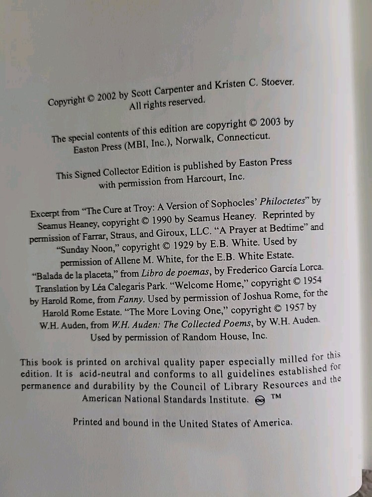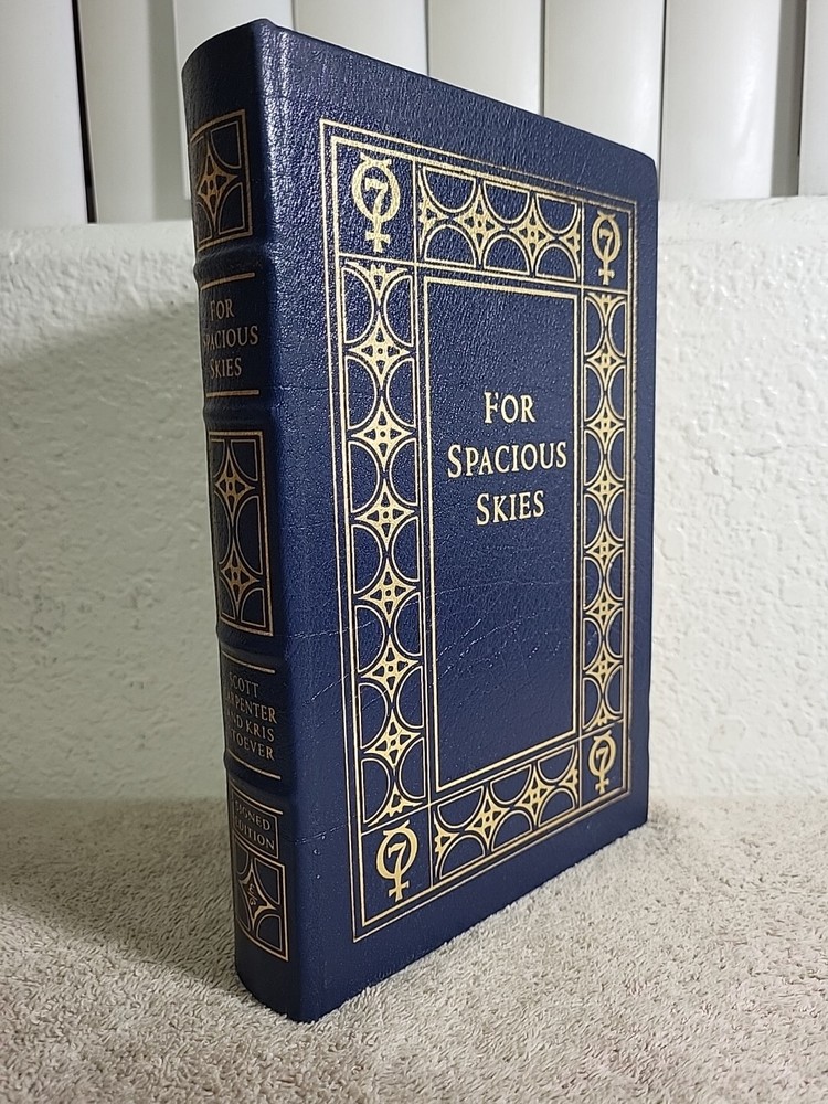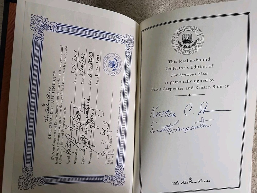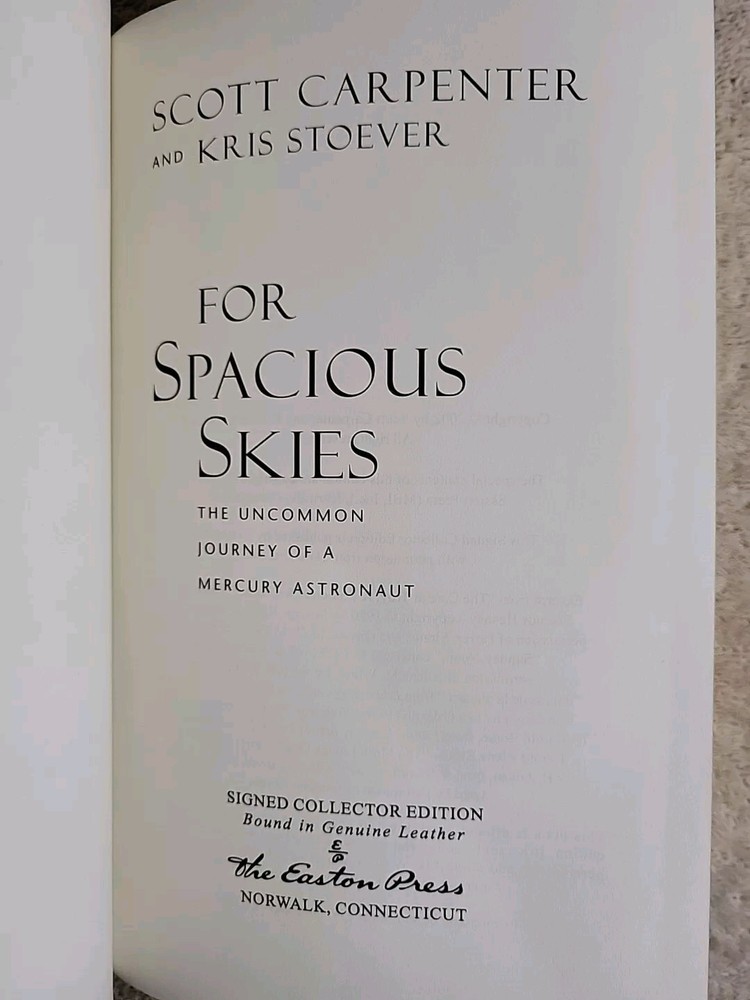 Unfortunately, someone printed their name on the bookplate and pasted it on a blank page. This is a rare and collectible book titled "For Spacious Skies" signed by Scott Carpenter and Kristen Stoever. It is a biography and autobiography written in English and published by Easton Press in Norwalk, Connecticut. The book is bound in leather and has special attributes as a collector's edition. The topic of the book is space travel and it is an original copy manufactured in the United States.