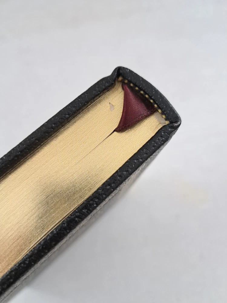 This is a beautiful book! The cover and the pages are in great condition. The only damage I can see on the book is a small Nick on the text block near the bookmark. I have taken a photo of this.