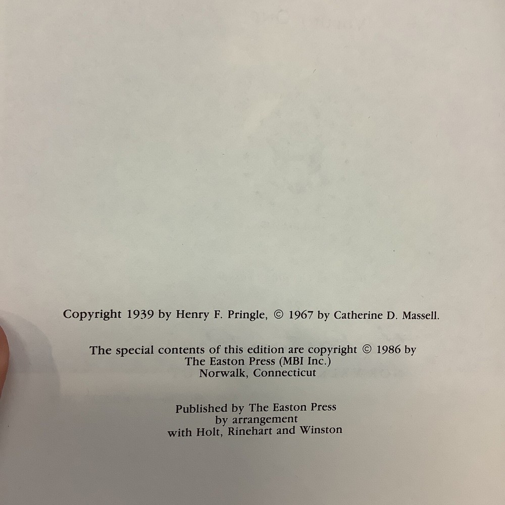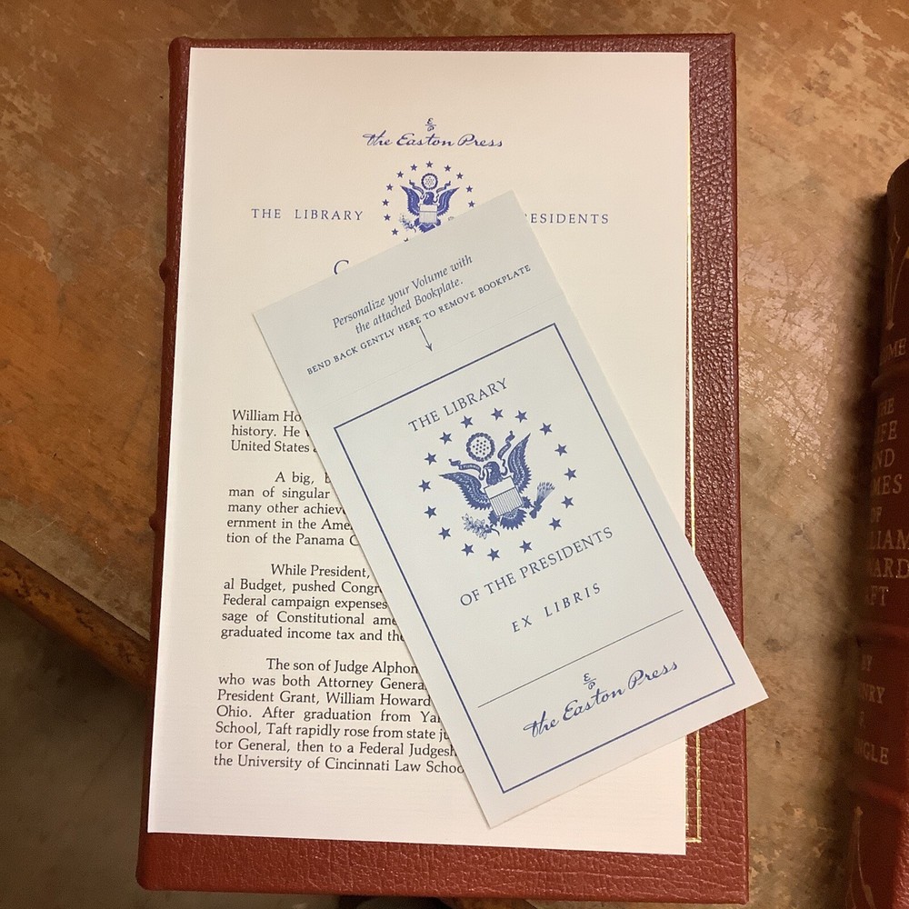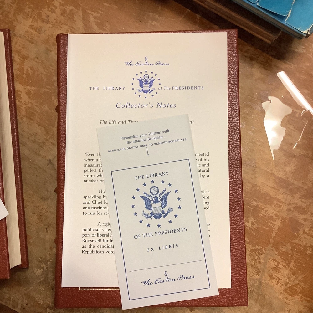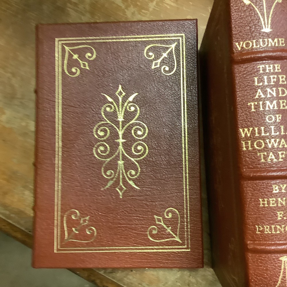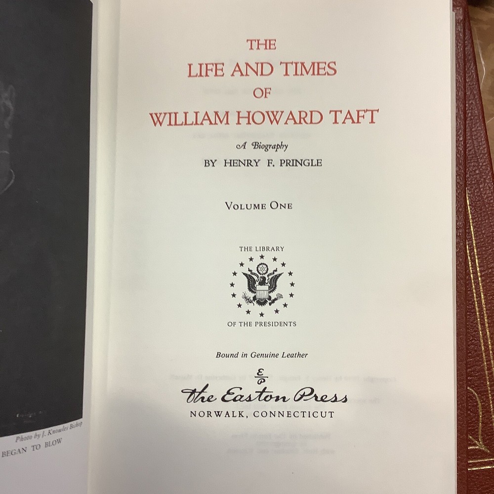 The Life and Times of William Howard Taft by Henry F. Pringle. Two volume full leather set published by The Easton Press in 1986. Full leather bindings with gilt lettering and decorations, page edges gilt, ribbon page marker. No markings. Sheet of Collector's Notes and blank Easton Press book plate are laid into each volume.