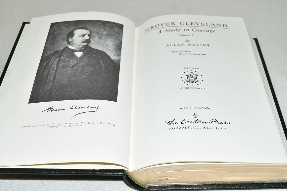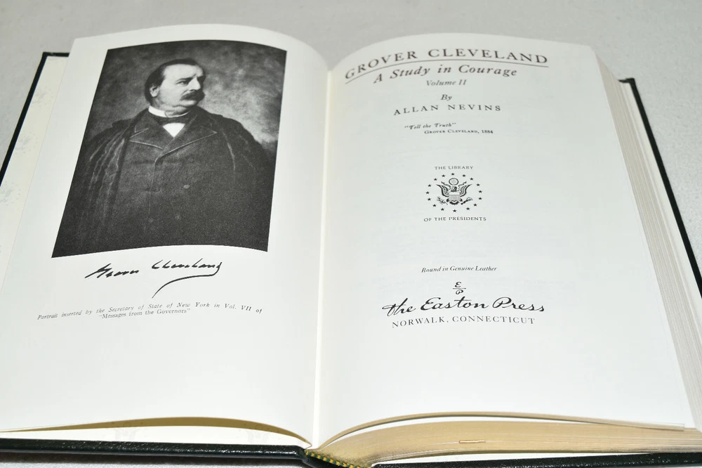 From the Easton Press Library of Presidents Collection... The Presidency of Grover Cleveland Complete 2 Volume Set A Study in Courage by Allan Nevins Copyright 1986 by The Easton Press Bound in Premium Full Leather These volumes contain all of the classic Easton Press trimmings: Premium Leather Decorated Endleaves Distinctive Cover Design Hubbed Spine, Accented in Real 22KT Gold Satin Ribbon Page Marker Gilded Page Edges Long-lasting, High Quality Acid-neutral Paper Smyth-sewn Pages for Strength and Durability Beautiful Illustrations Scarce titles in any condition, this two-volume set is in Near Fine - Fine condition. The front and back covers are both in near perfect condition and the gilded page edges show hardly any wear (see pictures)! There are no writing, markings, bookplates, or other signs of prior ownership in these books. The bindings are tight and square without spine lean. This set is part of The Library of Presidents Collection published by Easton Press and comes complete with both sets of Collector's Notes. It would be a beautiful addition to your Easton Press collection. Overall, this set is a grade collector's set. This set is very elusive in this superior condition, as only a limited number of them were ever published, so now is the time to act. Hopefully you can add this set to your collection and enjoy it in the years to come... Please Email Me With Any Questions You Might Have! Shipping Info: Buyer to Pay Shipping & Handling International Bidders Pay Extra Shipping Forms of Payment Accepted: Paypal Good luck and happy bidding! Powered by eBay Turbo Lister The free listing tool. List your items fast and easy and manage your active items.