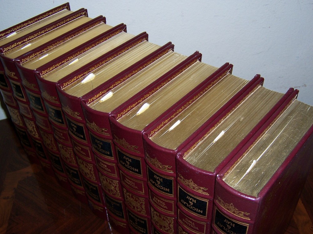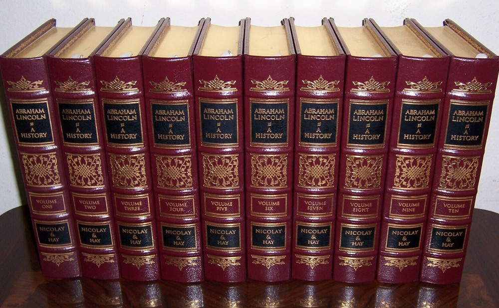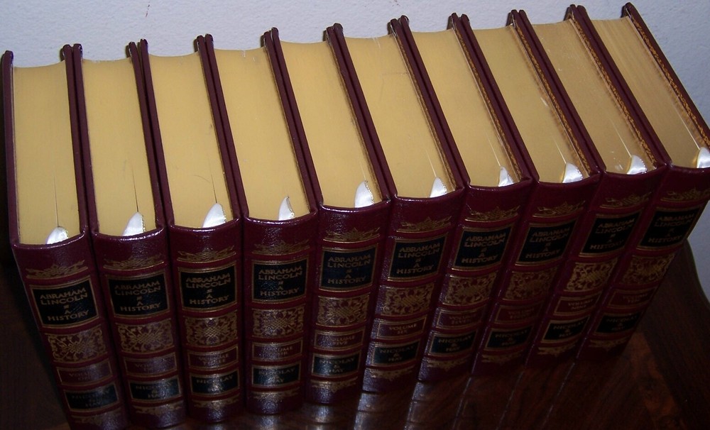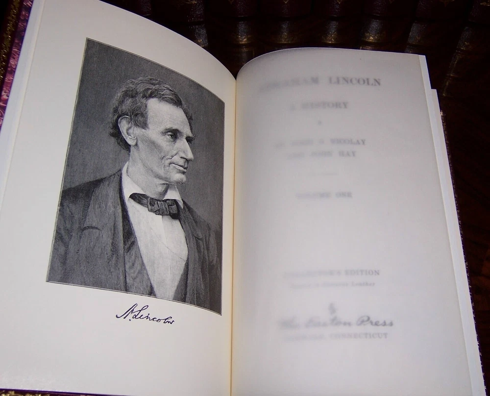 A superb reprinting of the historic 1890 biography of Abraham Lincoln Easton Press ABRAHAM LINCOLN: A HISTORY in ten volumes by John G. Nicolay and John Hay An exclusive leather-bound Deluxe Limited Edition. This Edition is strictly limited to a quantity of 400 copies. To commemorate the 150th anniversary of the Lincoln presidency, Easton Press is pleased to present Lincoln: A History, the definitive account of the President's life, fully authorized by Lincoln himself and written by his private secretaries. This superb Deluxe Limited Edition, limited to just 400 hand-numbered sets, has many extraordinary features: 1. All the original copy as it was written by Nicolay and Hay -- and read by enthusiastic Americans of the day. 2. Reproduced in a 10-volume set, the exact format in which the 1890 edition appeared. 3. Every illustration -- more than 350 maps, letters, and portraits of prominent figures in Lincoln's life -- has been beautifully restored. 4. An inside cover stamping unique to this Deluxe Limited Edition. 5. Beautiful marbled endsheets. 6. A gold-edged, satin-ribbon page marker. measured by 6" x 9 1/4", 17 1/2" linear shelf space BOUND IN GENUINE LEATHER Copyright by Easton Press Hubbed Spine, Bound in Premium Full Leather Distinctive Cover Design, Profusely Illustrated Moire Endleaves, Satin Ribbon Page Marker Accented in Real 22KT Gold, Gilt Page Edges Smyth-sewn Pages for Strength and Durability Long-lasting, High Quality Acid-neutral Paper LIST OF TITLES: complete in ten volumes: Volume I - X CONDITION DESCRIPTION: this set is in good and unread condition: BUT with marks/ nicks and wears over gilt page edges , clean/ like new inside pages, and binding is tight, beautiful bright endpapers and satin ribbon page marker. SHIPPING / HANDLING: The book will be shipped via USPS media mail with delivery confirmation, special care will be taken during packing to ensure you receive the books as described.