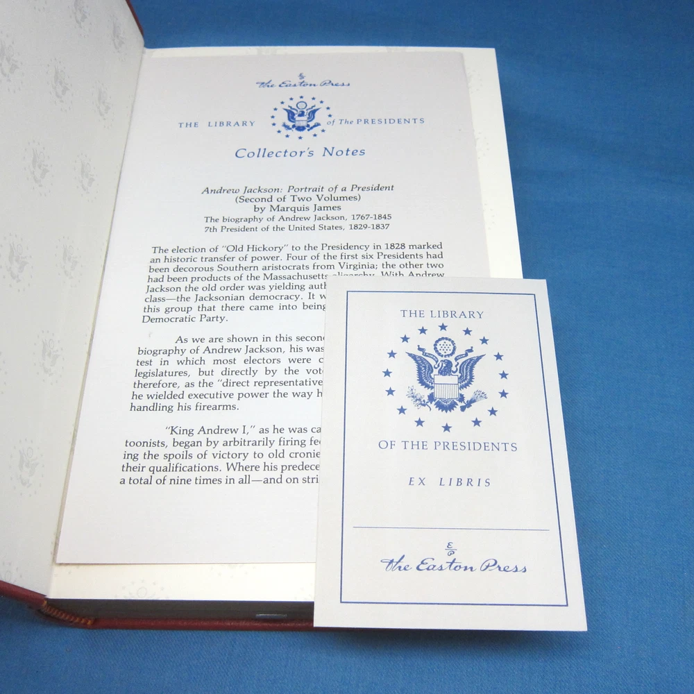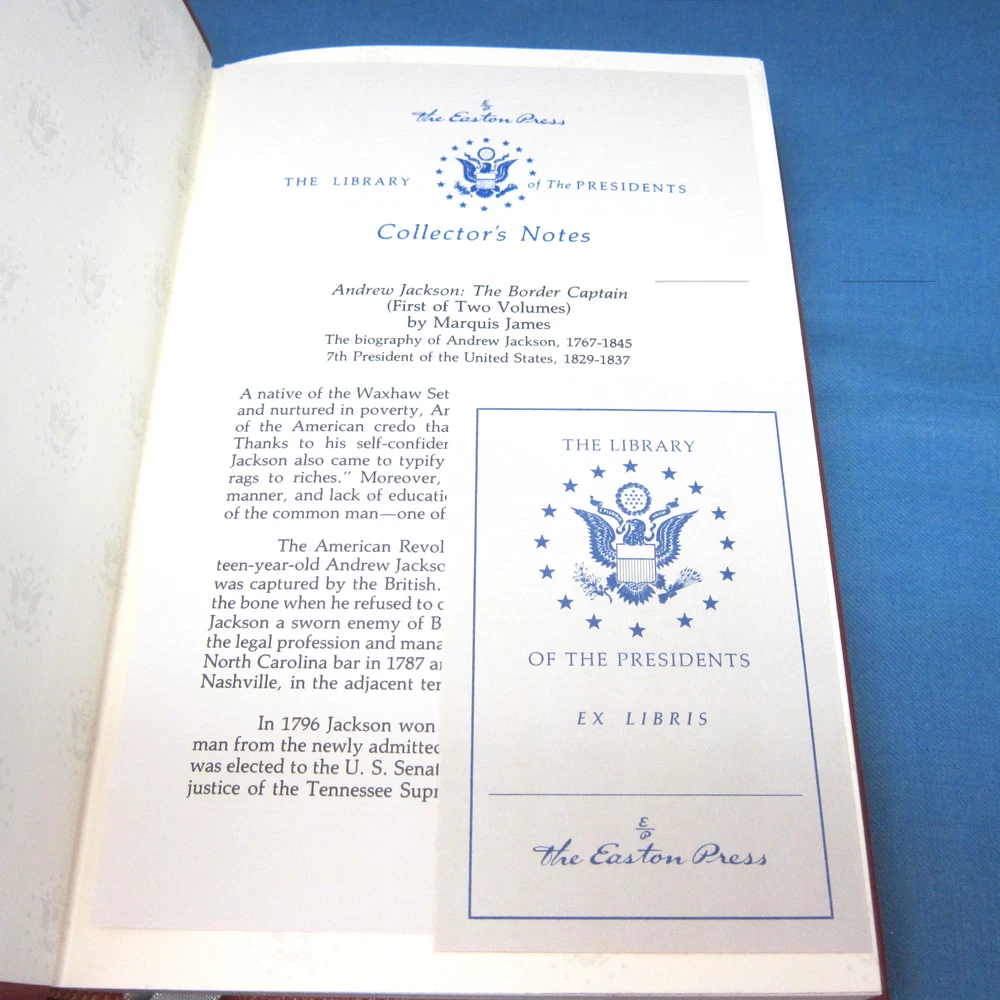 Andrew Jackson: Portrait of a President and Border Captain, 2 volume set by Marquis James. Beautiful leather-bound set from Easton Press. Both volumes include the Collector's Notes and a bookplate from Easton Press. Part of the Library of the Presidents series.