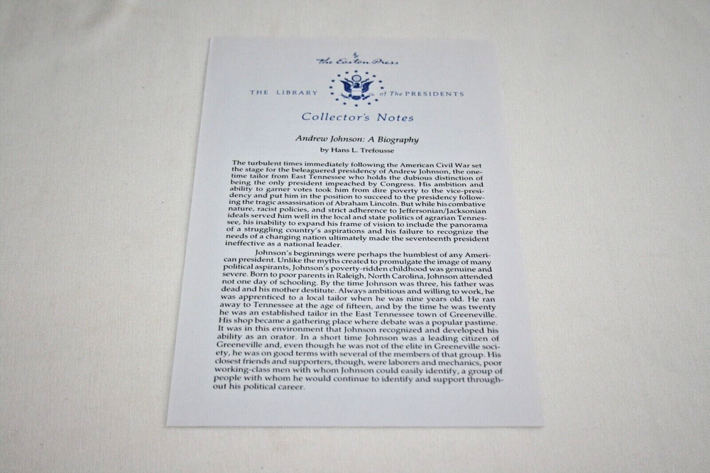 From the Easton Press Library of the Presidents Collector's Edition Series... Andrew Johnson A Biography by Hans L. Trefousse Copyright 1996 by The Easton Press Bound in Premium Full Leather This volume contains all of the classic Easton Press trimmings: Premium Leather Decorated Endleaves Distinctive Cover Design Hubbed Spine, Accented in Real 22KT Gold Satin Ribbon Page Marker Gilded Page Edges Long-lasting, High Quality Acid-neutral Paper Smyth-sewn Pages for Strength and Durability A very scarce title in any condition, this copy is in Absolute Mint and Unread condition. The front and back covers are both in Perfect condition and the gilded page edges show no wear at all! There are no writing, markings, bookplates, or other signs of prior ownership in this book. The binding is tight and square without spine lean. This book is part of the Library of Presidents published by Easton Press and comes complete with a Collector's Notes. It would be a beautiful addition to your Easton Press collection. This book is very elusive in this superior condition, as only a limited number of them were ever published, so now is the time to act. Hopefully you can add this book to your collection and enjoy it in the years to come... Please Email Me With Any Questions You Might Have! Shipping Info: Buyer to Pay Shipping and Handling International Bidders Pay Extra Shipping Good luck and happy bidding!