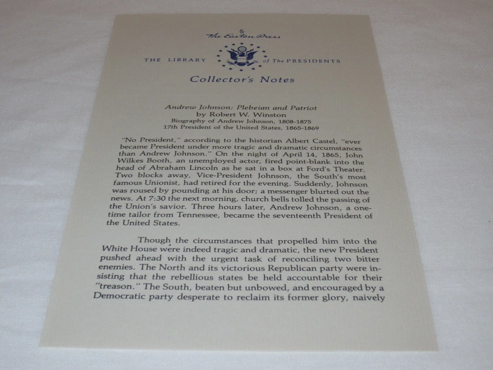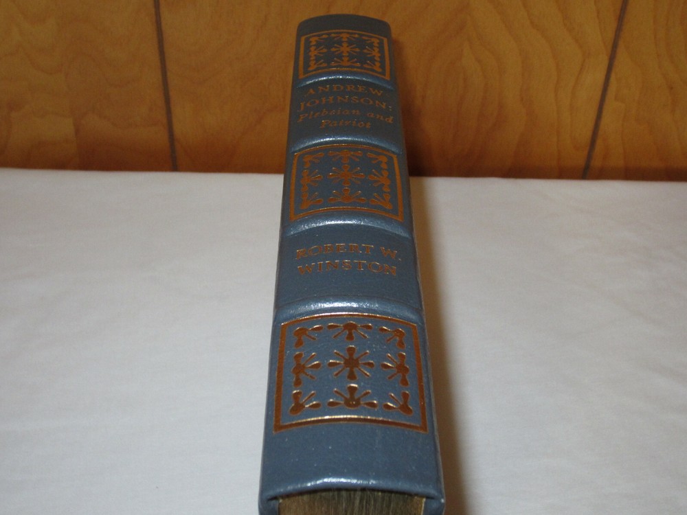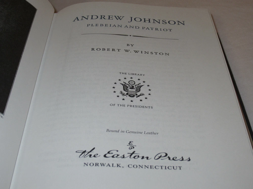 From the Easton Press Library of the Presidents Collector's Edition Series... Andrew Johnson Plebeian and Patriot by Robert Winston Copyright 1987 by The Easton Press Bound in Premium Full Leather! This volume contains all of the classic Easton Press trimmings: Premium Leather Decorated Endleaves Distinctive Cover Design Hubbed Spine, Acccented in Real 22KT Gold Satin Ribbon Page Marker Gilded Page Edges Long-lasting, High Quality Acid-neutral Paper Smyth-sewn Pages for Strength and Durability A very scarce title in any condition, this copy is in Fine and Unread condition. The front and back covers are both in near perfect condition and the gilded page edges hardly any wear! There are no marking, bookplates, or other signs or prior ownership. This book is part of the Library of Presidents published by Easton Press and comes complete with a Collector's Notes. It would be a beautiful addition to your Easton Press collection. Overall, this copy is a grade collector's book. This book is very elusive in this superior condition, as only a limited number of them were ever published, so now is the time to act. Hopefully you can add this book to your collection and enjoy it in the years to come... Please Email Me With Any Questions You Might Have! Shipping Info: Buyer to Pay Shipping and Handling International Bidders Pay Extra Shipping Good luck and happy bidding!