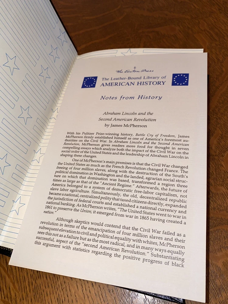 This Easton Press collector's edition book titled "Abraham Lincoln and the Second American Revolution" by James M McPherson is a must-have for any political enthusiast. The leather bound book, printed in 1991, is an original copy and features special attributes that make it a valuable addition to any collection. The book is written in English and covers topics related to political history, specifically the Second American Revolution. The author, James M McPherson, is a renowned expert on the subject and has provided a comprehensive overview of the events leading up to the revolution. The book is perfect for anyone interested in the history of North America and the political aspects of Abraham Lincoln's life. Excellent condition. Feel free to contact me if you have any questions.
