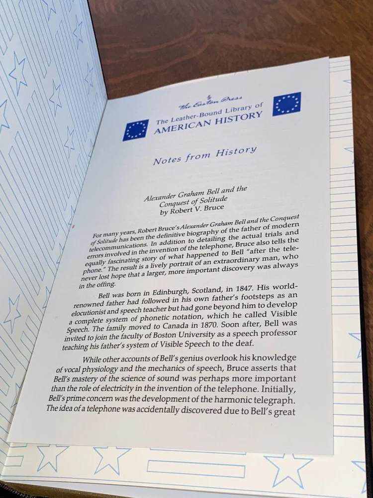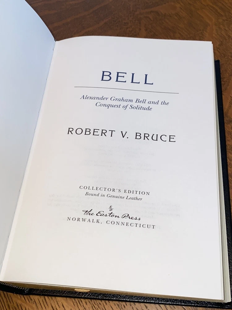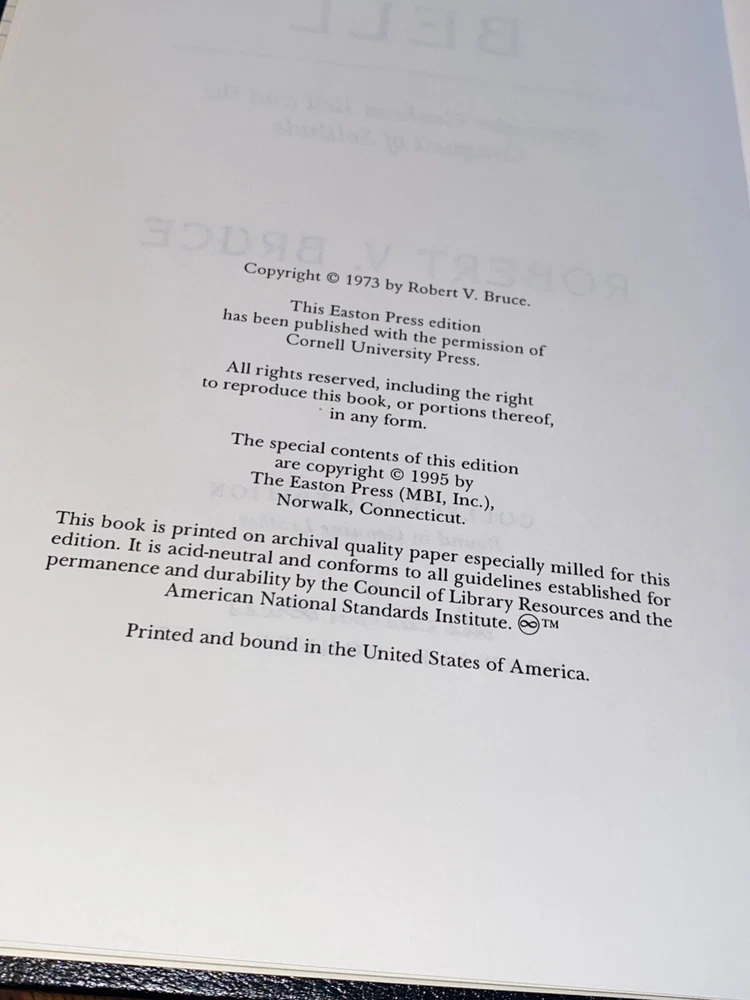 The product is an Easton Press luxury edition book titled "Alexander Graham Bell & the Conquest of Solitude" by Robert V. Bruce, published in 1995 in Norwalk, Connecticut. It is a biography on the subject of Alexander Graham Bell, featuring photo illustrations and adhering to archival standards with acid-free paper, embossed covers, and a leather binding. This collector's edition book includes special attributes such as gold gilt, a satin ribbon bookmark, and is sealed in like new condition, making it a valuable addition for fans of nonfiction and North American history. Excellent condition. Feel free to contact me if you have any questions.