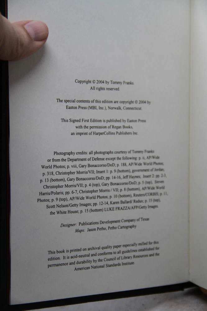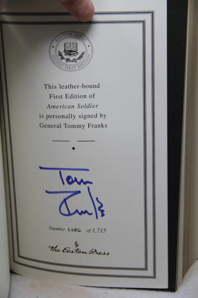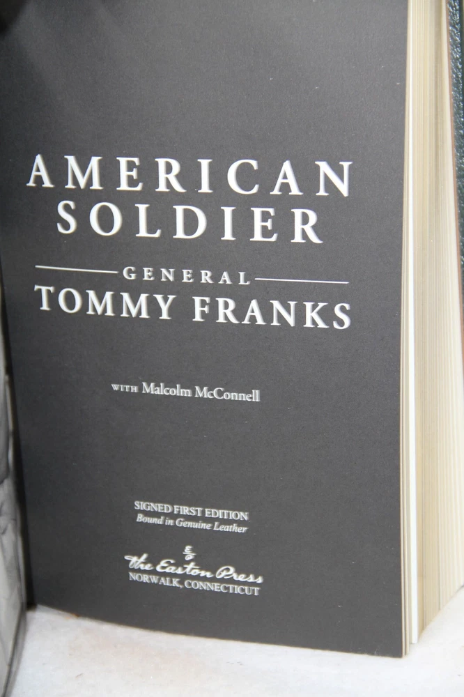 This Easton Press American Soldier book is a rare and valuable addition to any collection. It features a limited edition collector's design and is signed by the author, General Tommy Franks. Published by Easton Press, this book is a must-have for anyone interested in collecting rare and collectible books. Excellent Condition, shows no wear