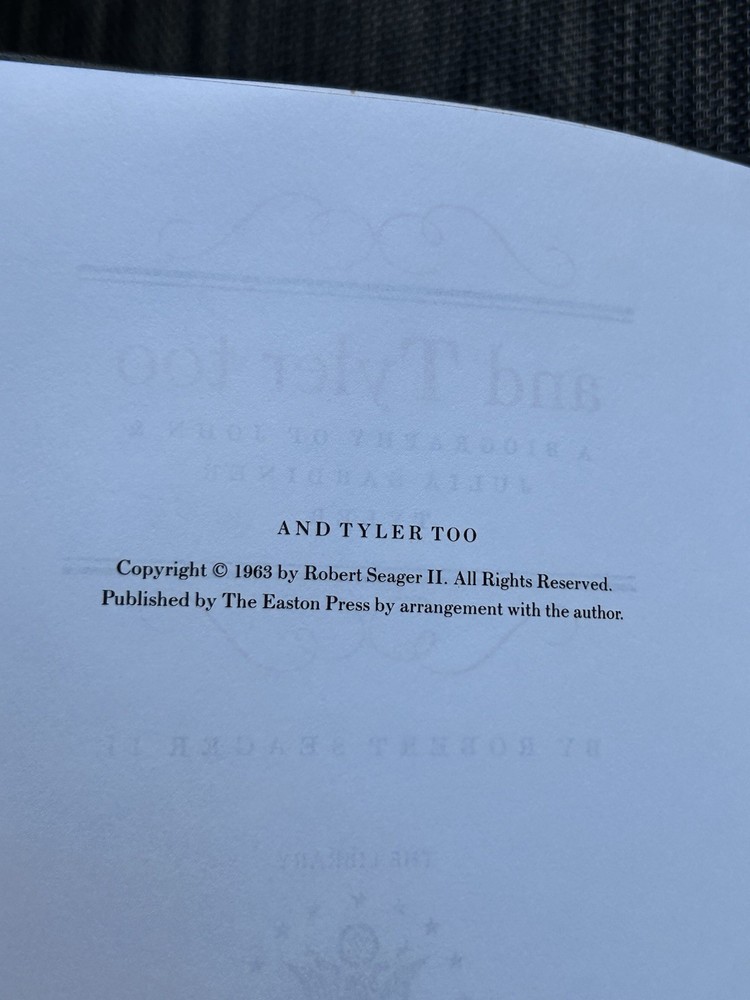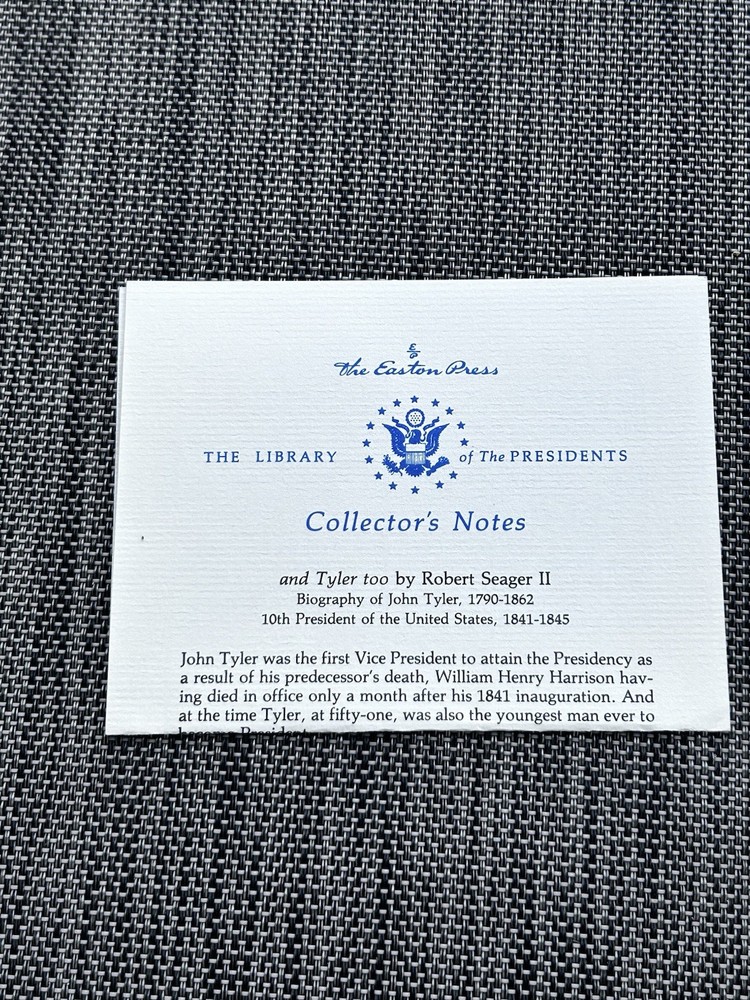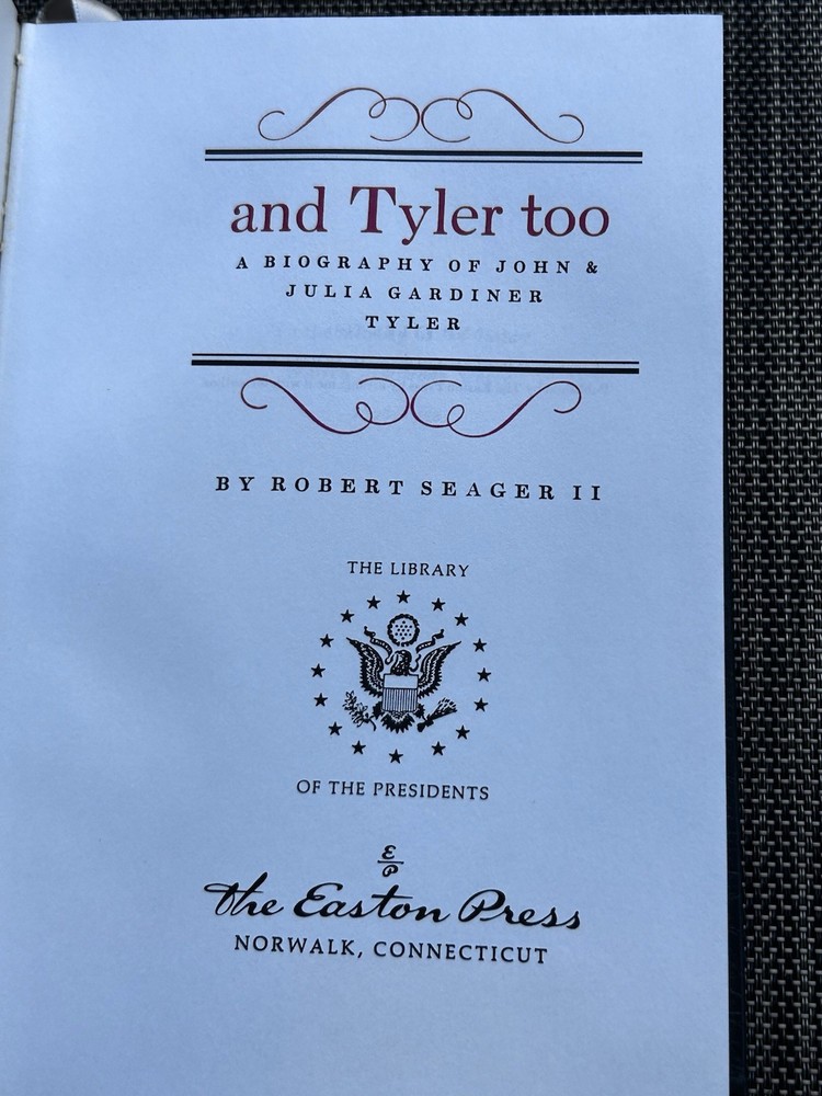 And (John) Tyler Too by Robert Seager II. Near Fine, Leather Bound. Book accented in 22kt gold. Printed on archival paper with gilded edges. The endsheets are of moire fabric with a silk ribbon page marker. Smyth sewing and concealed muslin joints to ensure the highest quality binding. This book is in full leather with hubbed spines. Easton Press, 1963. Near fine.