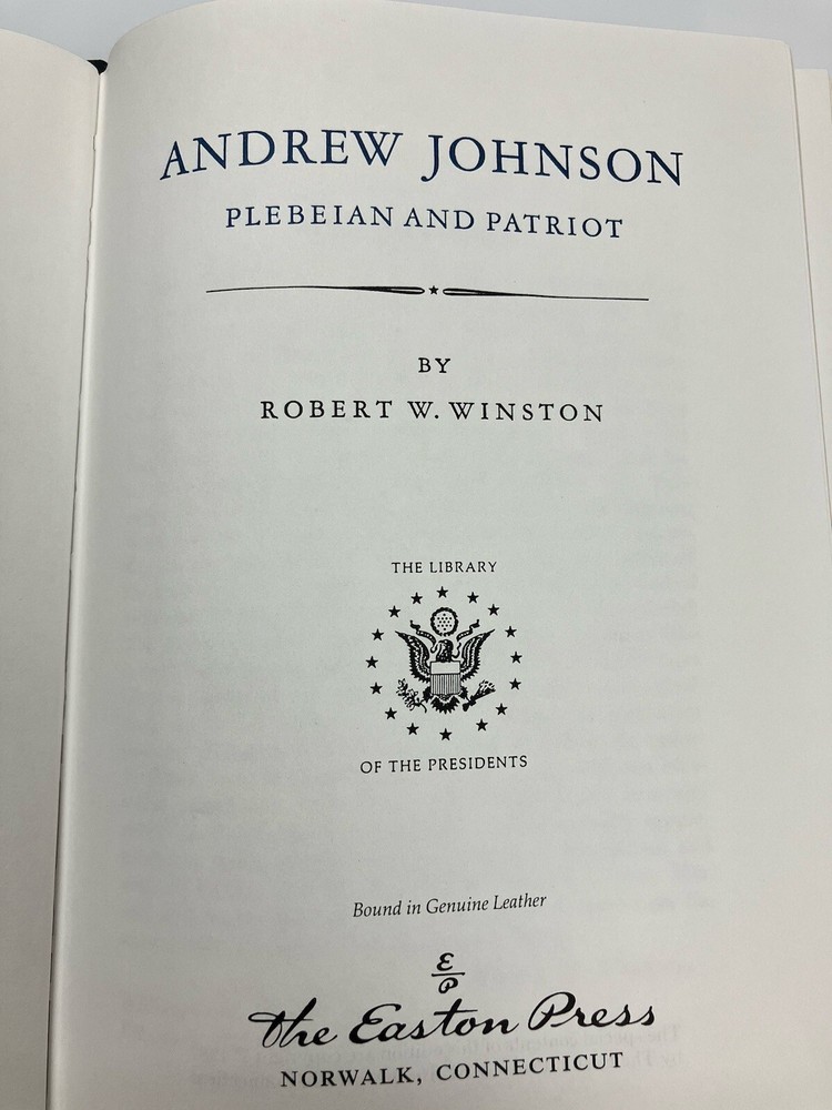 This is a collector's edition book published by Easton Press. The leather-bound book features a fascinating political topic on President Andrew Johnson. The author, Robert W Winston, provides a unique perspective on the subject matter, making this book a must-have for any political enthusiast. The book was printed in 1987 and is in excellent condition. It was originally published in 1929. It is bound in genuine leather with accents inn 22kt gold on the spine. It is unread, near mint condition.