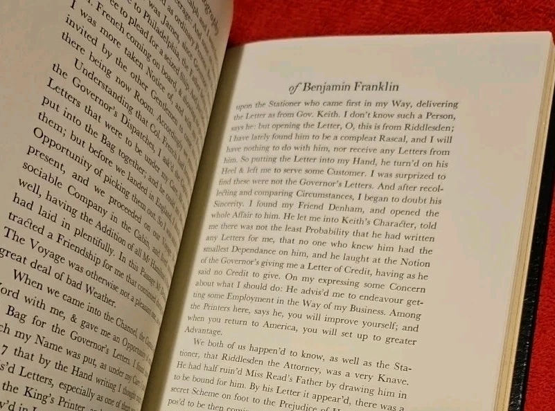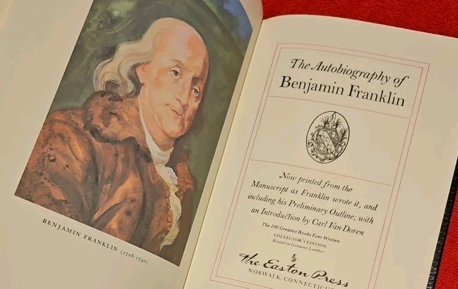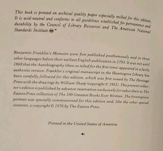 Explore the wisdom and wit of one of America's greatest minds with the "Autobiography of Benjamin Franklin" from the Easton Press 100 Greatest Series. This luxurious leather-bound edition is a testament to the enduring charm of Franklin's writings, offering readers both a collector's item and a timeless piece of literature. Crafted with care in the United States and presented in English, this book is a treasure for any bibliophile. The Autobiography is not signed and not personalized, ensuring that this classic remains a universal addition to any library. Delve into the adventures and insights of Benjamin Franklin, presented in a format as splendid as his ideas. Excellent Condition- see photos Check my rating and bid with confidence!