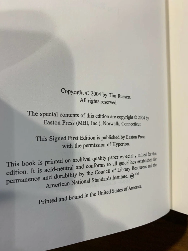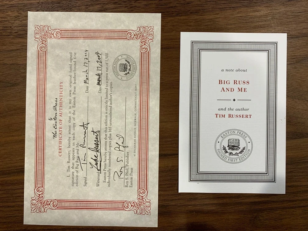 This signed Easton Press edition of *Big Russ and Me* is a stunning collector’s piece. The full leather binding, 22kt gold accents, and archival paper make it feel luxurious, while the Smyth sewing ensures durability. The hubbed spine and silk ribbon marker add elegance, and the COA guarantees authenticity. A must-have for fans of Tim Russert—beautiful craftsmanship with just minor signs of use.