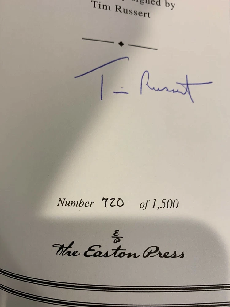 Tim Russert - BIG RUSS AND ME - Signed 1st Edition / Easton Press 1st Printing Hardcover Norwalk, Connecticut Easton Press, Leather Bound Limited Edition Signed by Author. Includes COA. Book accented in 22kt gold. Printed on archival paper with gilded edges. The endsheets are of moire fabric with a silk ribbon page marker. Smyth sewing and concealed muslin joints to ensure the highest quality binding. This book is in full leather with hubbed spines. Slight wear on cover and light trace of pencil marking on inside cover page - See pics for details. Tim Russert Big Russ and Me Signed First Edition Bound in Genuine Leather The Easton Press 2004 Number 720 of 1,500 Includes Certificate of Authenticity and Author Note
