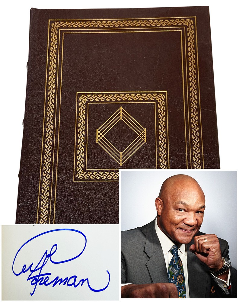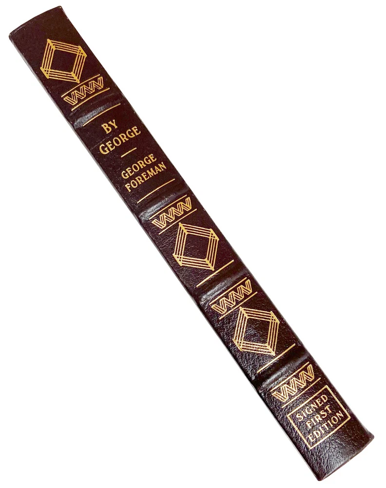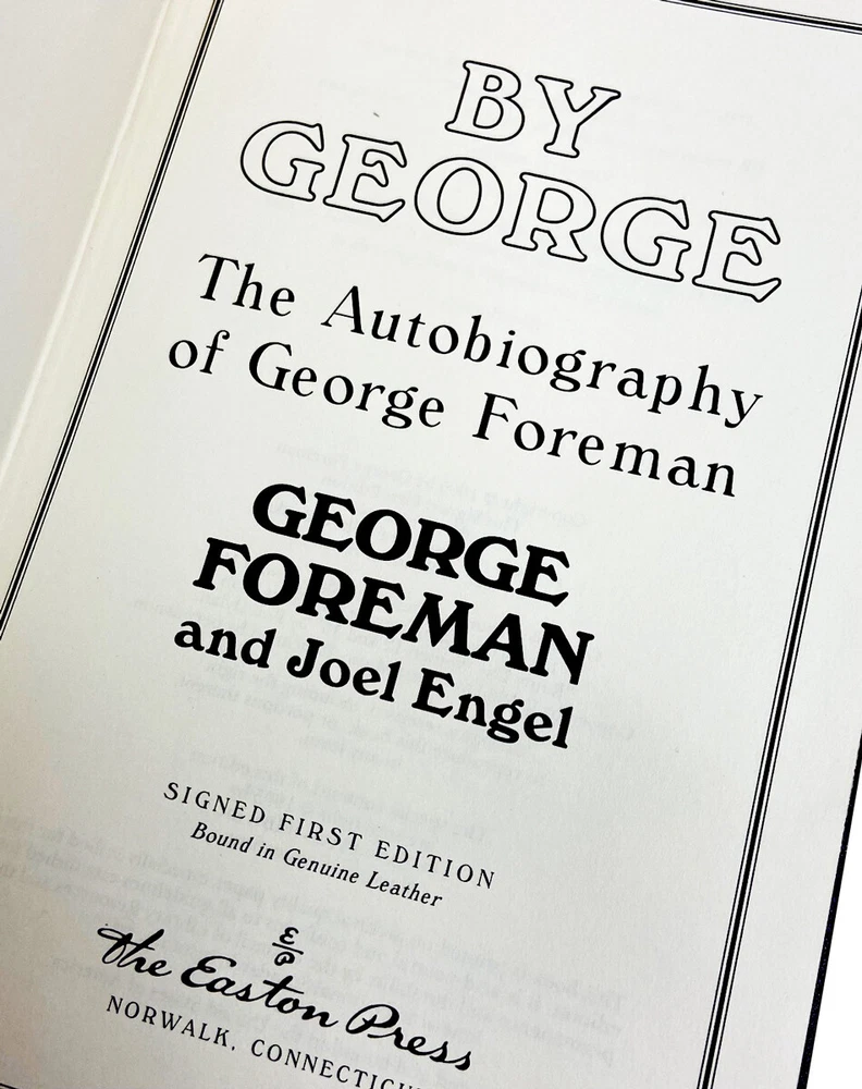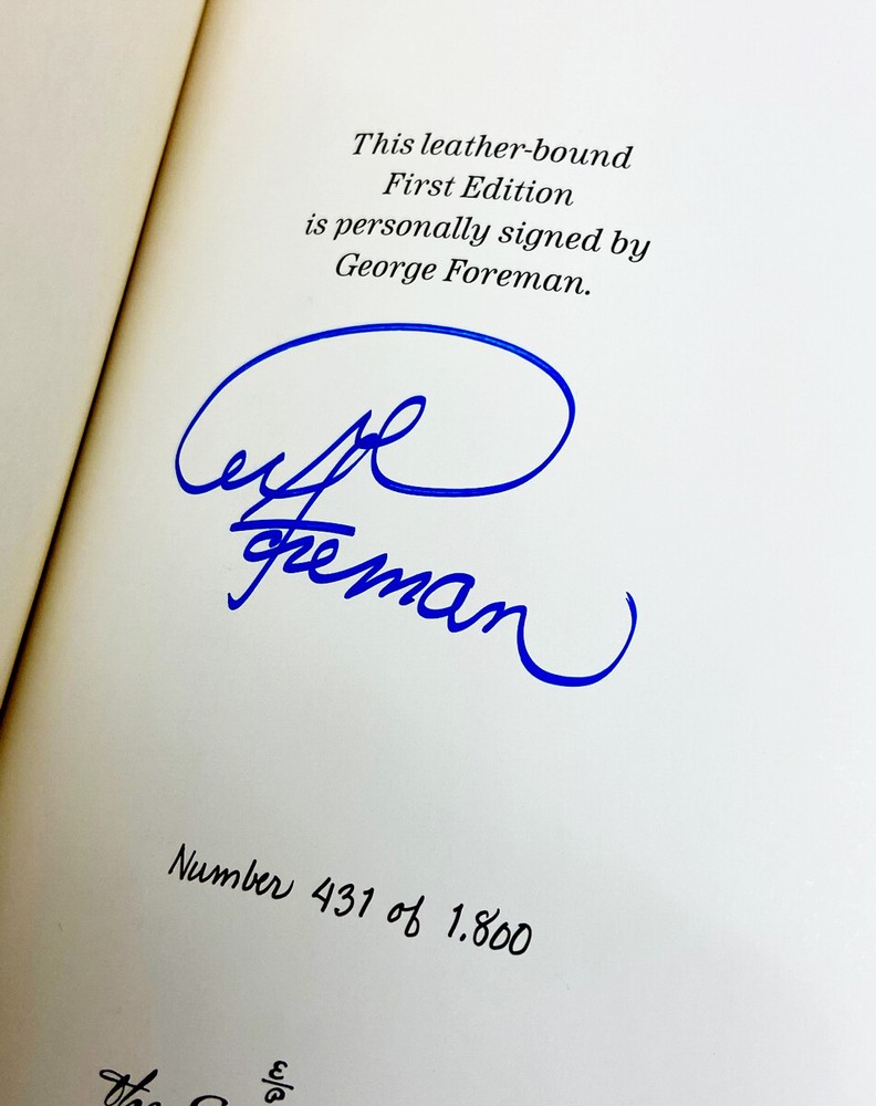 Personally signed by George Foreman SIGNED NUMBERED FIRST EDITION. No. 431 of 1,800. Many of these books were not numbered. Norwalk, CT Easton Press 1995. George Foreman "By George: The Autobiography of George Foreman", Signed Limited First Edition. Full genuine leather. Signed by the author. Numbered edition by the publisher. Near Fine condition. George Edward Foreman (born January 10, 1949) is an American former professional boxer, entrepreneur, minister and author. In boxing, he was nicknamed "Big George" and competed between 1967 and 1997. He is a two-time world heavyweight champion and an Olympic gold medalist. As an entrepreneur, he is known for the George Foreman Grill. About the book Heavyweight boxing champion George Foreman describes his childhood, family, ring failures, and his success in reclaiming his title at the age of forty-five through determination and humor. Include all the classic Easton Press qualities: Premium Leather Silk Moire Endleaves Distinctive Cover Design Hubbed Spine, Accented in Real 22KT Gold Satin Ribbon Page Marker Gilded Page Edges Long-lasting, High Quality Acid-neutral Paper Smyth-sewn Pages for Strength and Durability Beautiful Illustrations
