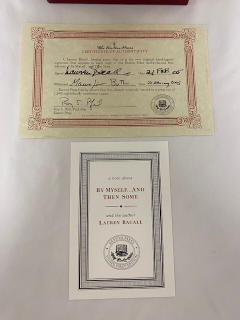 Lauren Bacall was barely 20 when she made her Hollywood debut with Humphrey Bogart and became an overnight sex symbol. Their romance on and off screen made them Hollywood's most celebrated couple and together they produced some of the most electric scenes in movie history. But when Bogart died of cancer in 1957, Bacall had to find a way of living beyond the fairytale and ironic way she had evolved. In a time of post war communism, Hollywood blacklisting and revolutionary politics she moved with the legends: Hemingway, the Oliviers, Katharine Hepburn, Bobby Kennedy, an engagement to Frank Sinatra and a second turbulent marriage to Jason Robards. Now at 80, BY MYSELF AND THEN SOME brings her story up to date including her recent films and Broadway runs, fond memories of her children and many close lifelong friendships, not least the greatest love of her life, Humphrey Bogart. 506 pages. Silk marker came unglued (refer to photo) otherwise this book is in "great" condition. Well-kept in smoke free, pet free home.
