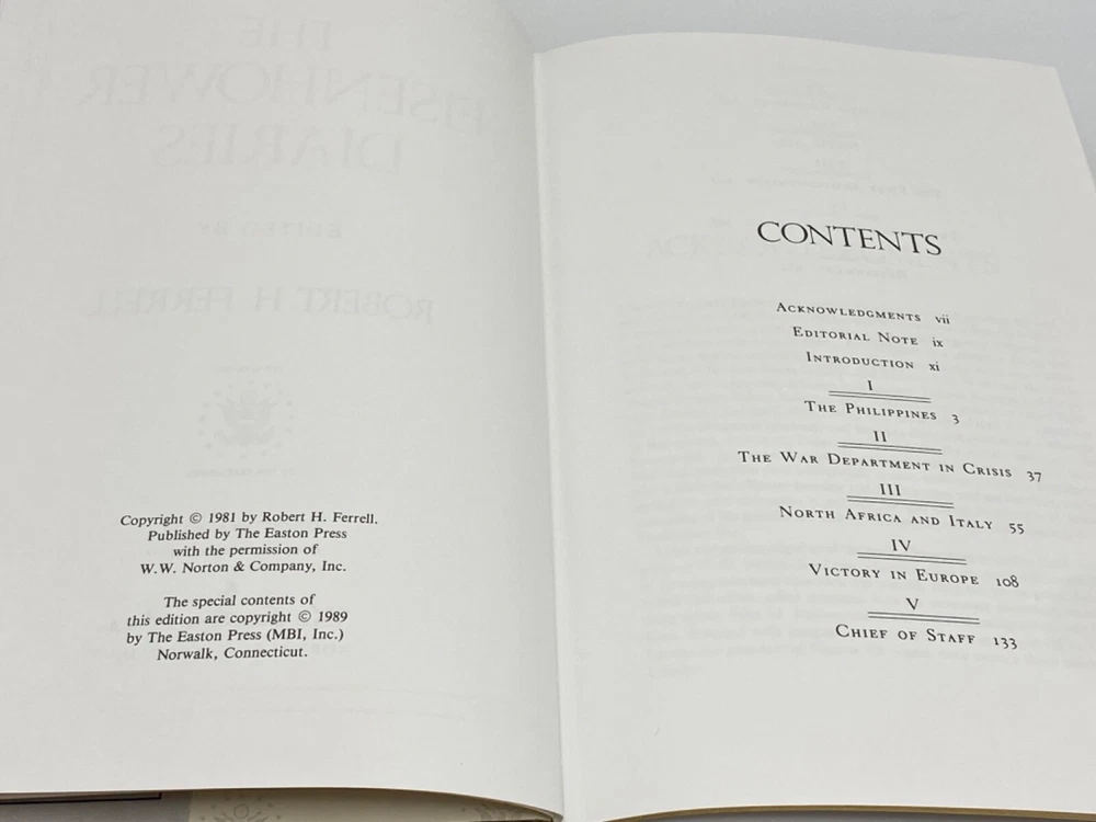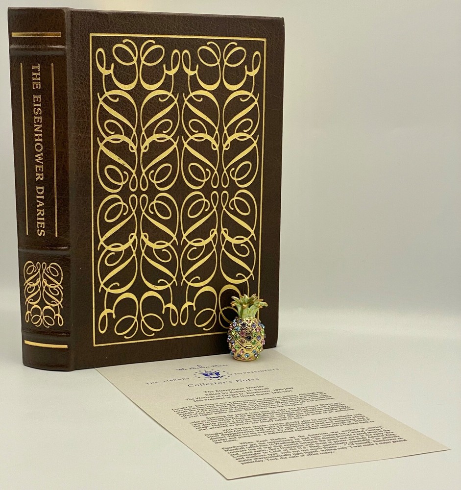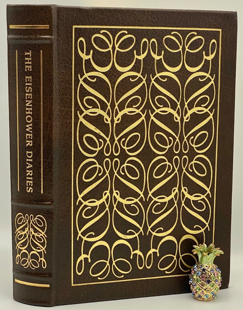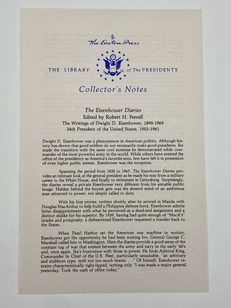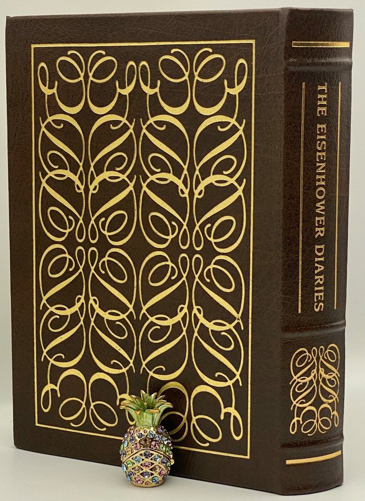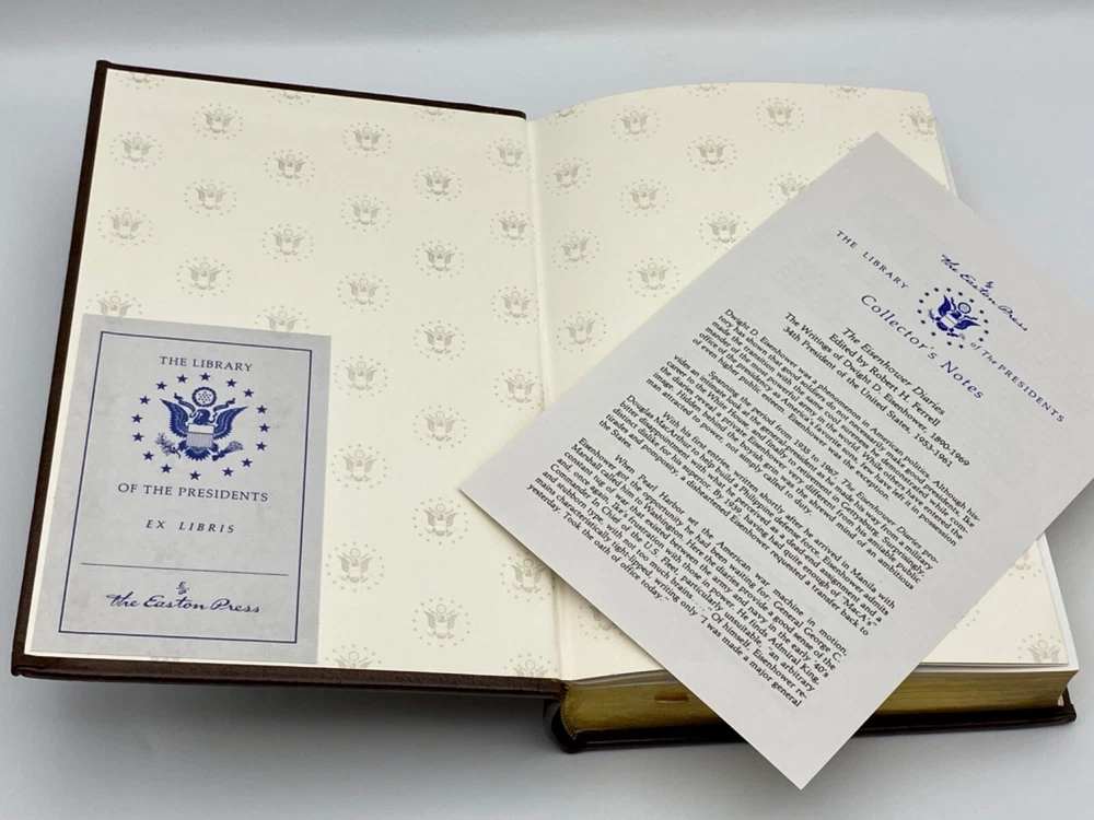 MAKES THE PERFECT GIFT FOR ANY FAN OF PRESIDENTIAL MEMOIRS / HISTORY OF AMERICAN PRESIDENTS / AMERICANA ** PLEASE READ : Mahalo for taking the time to look at our listing. We truly appreciate it. We always do our BEST to give you the most accurate description of these beautiful books. If, however, you have any SPECIFIC questions about the SIZE of the book, NUMBER of pages, TYPE of leather, SMELL or FEEL of the book, PLEASE email us through EBay’s mail system BEFORE you bid, and we will be HAPPY to give you more information. We want you to be completely happy with your purchase and keep you as our customers for years to come!** DESCRIPTION: Easton Press full-leather binding, LONG OUT edition of THE EISENHOWER DIARIES, edited by Robert H. Ferrell. THIS IS A VINTAGE HEIRLOOM EASTON WITH LAVISH GILT IMPRESSIONS TO THE BOARDS AND SPINE with AWESOME PHOTOGRAPHS. IT IS ONE OF THE MOST HIGHLY PRIZED & MOST BEAUTIFUL EDITIONS OF THIS CLASSICS YOU CAN FIND . COLLECTOR’S NOTES & ATTACHED, BLANK BOOKPLATE ARE INCLUDED. 🍍 NOT INCLUDED… 😃 ABOUT THE BOOK: The diaries of the late Dwight D. Eisenhower are unique documents, in that they alone, in the mass of Ike’s prose, reveal the innermost thoughts of the soldier-statesman. In his books―the memoir of the Second World War, the two large volumes on the presidency, the incomplete autobiography written near the end of his life―Eisenhower related the course of events over the years, with descriptive detail and frequently with humor, but he usually stayed away from analysis. In his many private letters to friends and acquaintances, some of which have been published, he was more frank, but he still held back. And the public record of his military career and of his presidency does not reflect many open, frank statements, proofs that the soldier-president thought long and deeply about issues, personal or public; it has given substance to the speculation by many of his contemporaries and by some later students of Eisenhower that he was essentially a public relations man and that his life was all outward―an expression of assent and agreement or at least of forebearance, of a man who never had an idea or, if he did, would quickly chase it out of sight. CONDITION: Book is in LIKE NEW condition for its age with a couple of negligible rubs to the gilt page ends, barely worth noting, and the original attached blank bookplate, ready for your personalization (SEE PICS FOR FURTHER DETAILS). NO WRITING FROM PREVIOUS OWNER, ETC. It is a BEAUTIFUL edition. SHIPPING: FREE TO US ADDRESSES ONLY. INTERNATIONAL $ based on location. WE SHIP PRIORITY MAIL & PACK VERY WELL. Please check out our other listings of Easton Press, Franklin Library, Limited Editions Club, First Edition Library, International Collectors Library, Heritage Press and Folio Society editions. WE DO COMBINE SHIPPING IF YOU PURCHASE MORE THAN ONE COPY. Mahalo for looking at our listings! By bidding/purchasing this item, you are helping a very grateful family who sends you our WARMEST ALOHA & MAHALO!