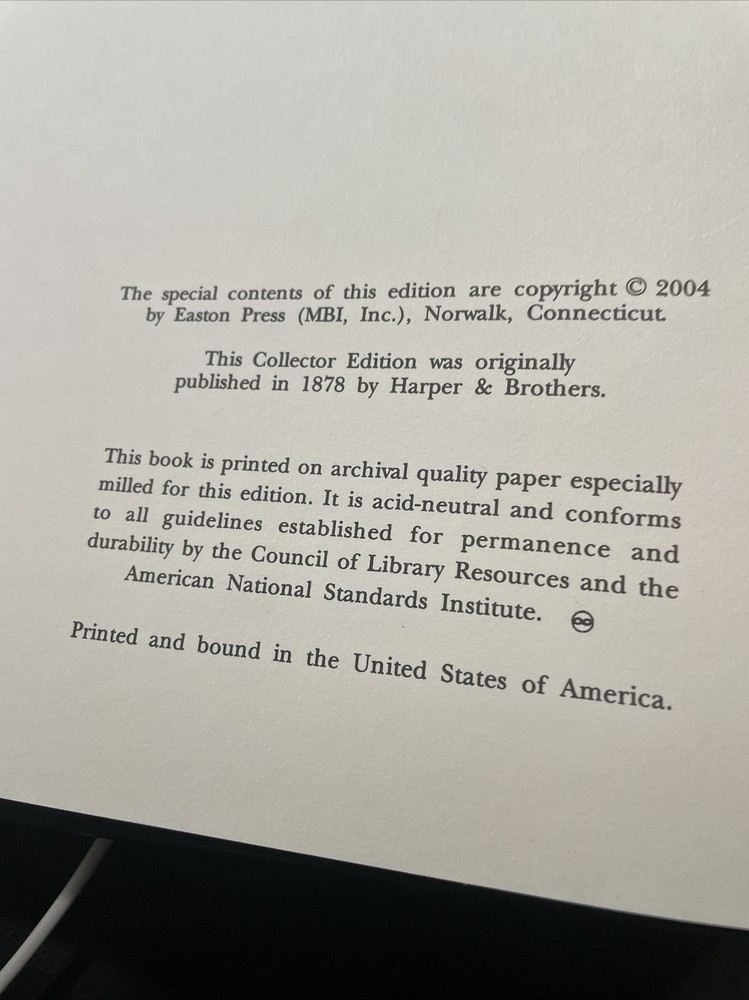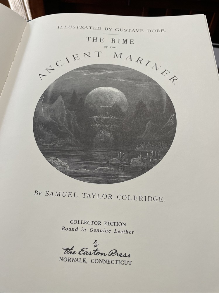 Easton Press Collector Editions Rime of the Ancient Mariner Samuel Coleridge. The special contents of this edition are copyright 2004 by Easton press Norwalk Connecticut. Collectors edition was originally published in 1878 by Harper and Brothers. The book is printed on archival quality paper especially milled for this edition. it is acid neutral And confirms to all the guidelines established for permanence and durability by the council of library resources and the American national standards institute printed and bound in the United States of America