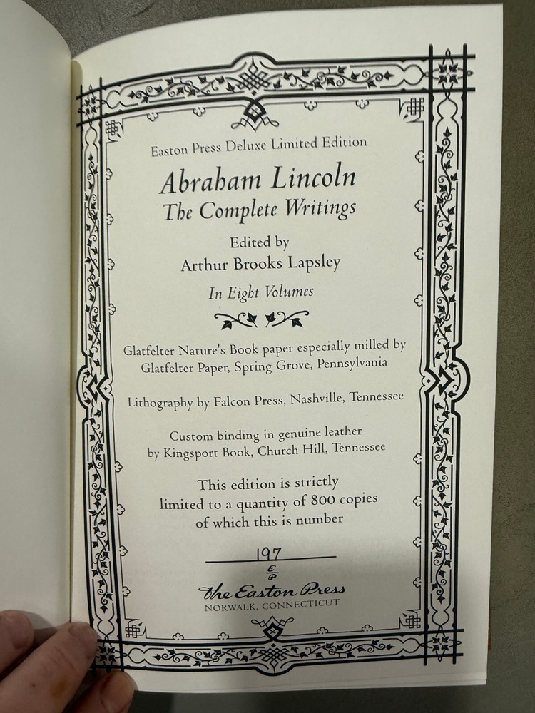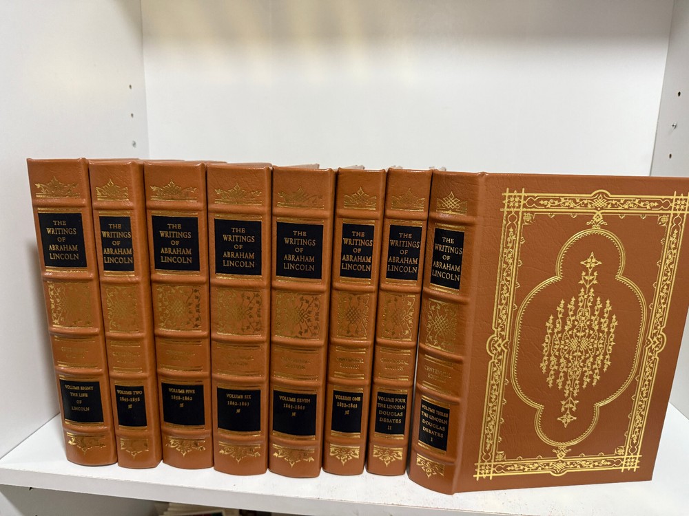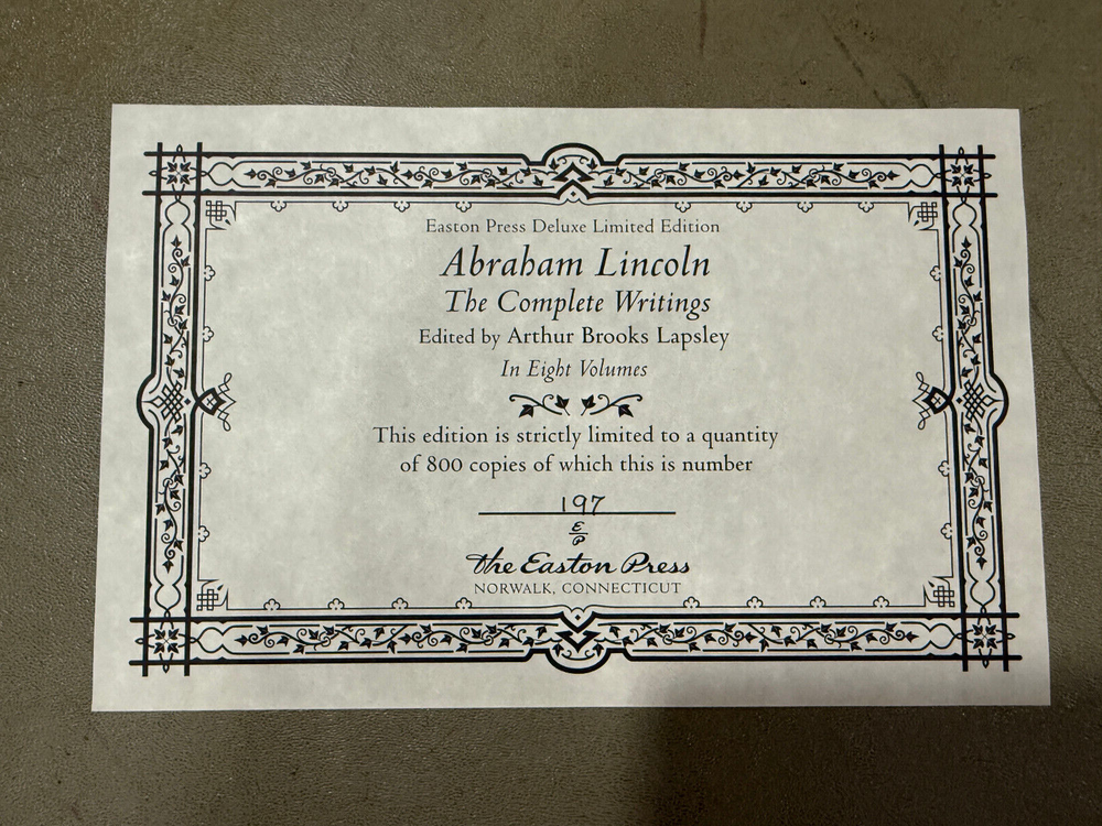 Complete Writings of Abraham Lincoln 8 vols LIST OF TITLES: complete in eight volumes: Volume One: 1832-1843 Volume Two: 1843-1858 Volume Three: The Lincoln-Douglas Debates I Volume Four: The Lincoln-Douglas Debates II Volume Five: 1858-1862 Volume Six: 1862-1863 Volume Seven: 1863-1865 Volume Eight: The Life of Lincoln Easton Press Limited Centennial Edition Excellent Condition! New Books get listed daily !!! 100s of Easton Press and Franklin Library books available!! All books get cleaned with a leather cleaner to remove any dust, odor and restore the beauty of leather!! Combined Shipping Discount: USA buyers - every book $1 off International combined shipping: 1 or 2 books - $45 3 or 4 books - $75 5 + books $17 per book 10+ books $13 per book WE SHIP DAILY!! RETURNS: Hassle-Free 30-days return policy and we pay for a return !! Check our Inventory (Link to eBay Store): http://stores.ebay.com/EastonFranklinBooks
