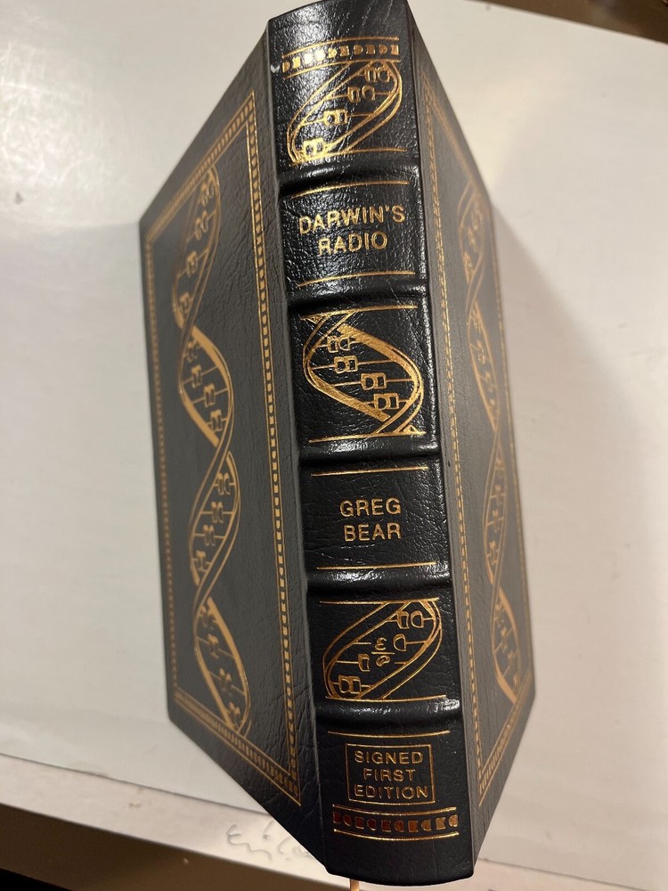 'Darwin's Radio' by Greg Bear. Signed first edition bound in Genuine Leather published by Easton Press in 1999. 430 pages and measures approx 6.5" x 9.5". Solid book in nice fine condition with very light wear and no marks or damage. Add 6.00 domestic postage. All books are carefully packaged in plastic sleeves, cardboard in front and back, in bubble mailers. We have been in the book business for 25 years and selling on eBay since 1996. We ship by USPS within 2 days of payment receipt. Delivery is usually 4-5 days but can take over a week at times. We can quote expedited postage if you need it quicker. Combined purchases should reduce total postage (unless it's already free). We highly value customer satisfaction and will resolve any issues promptly. Please check out my other listings and thanks for looking!