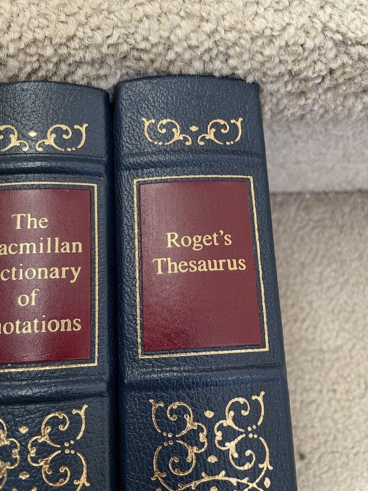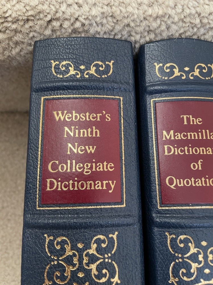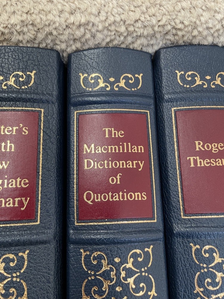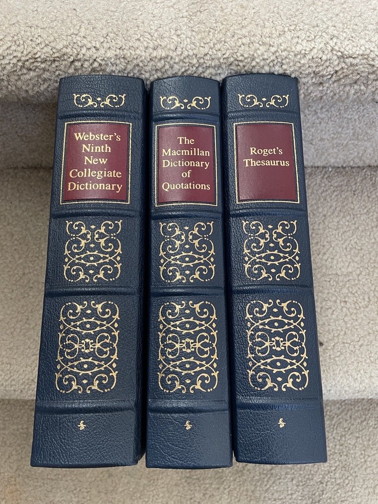 Easton Press 3 Volume Desk Reference Set: Webster's Ninth New Collegiate Dictionary, Roget's Thesaurus, and The MacMillan Dictionary of Quotations. The set is complete. The books are full leather. These books are in near mint condition with extremely little wear (one bumped corner). The gold on the covers looks like new. The end pages show no fading. The gilt on the edge of the pages is in almost perfect condition with most volumes perfect. Only one has light gilt loss on the top. Please see photos. We try to describe as accurately as possible so you will be satisfied with your purchase. We have more books from this set on eBay and we would be happy to combine on shipping to save you money. All books are sent with insurance via USPS Media Mail.