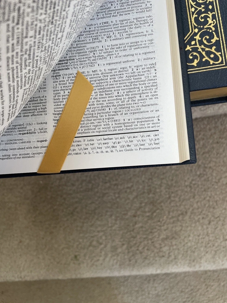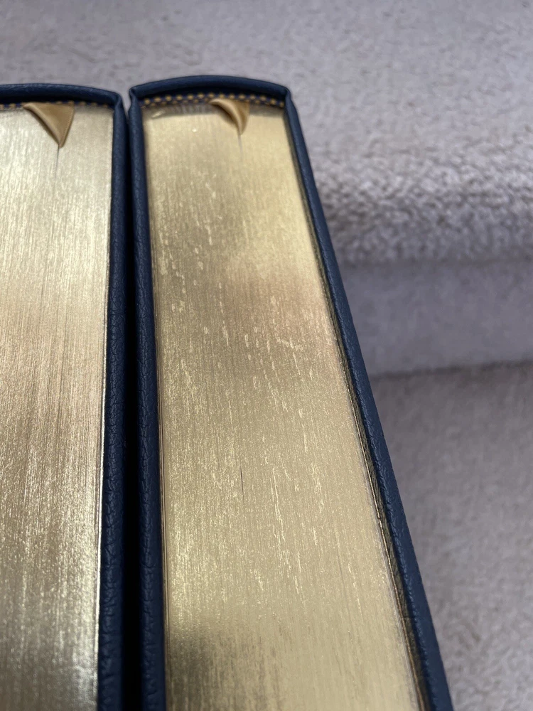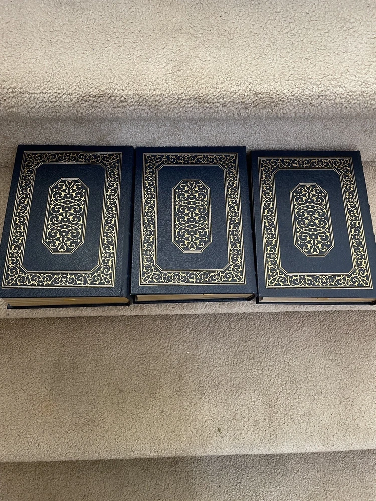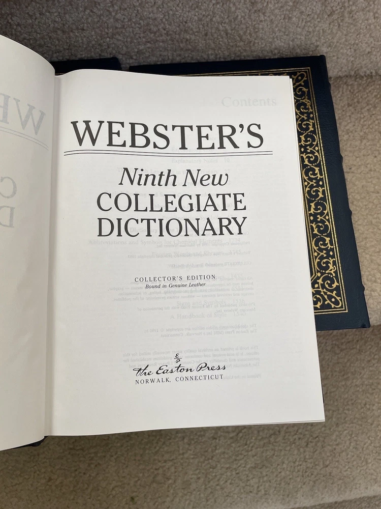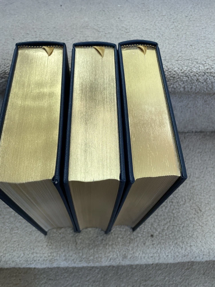 Easton Press 3 Volume Desk Reference Set: Webster's Ninth New Collegiate Dictionary, Roget's Thesaurus, and The MacMillan Dictionary of Quotations. The set is complete. The books are full leather. These books are in near mint condition with extremely little wear (one bumped corner). The gold on the covers looks like new. The end pages show no fading. The gilt on the edge of the pages is in almost perfect condition with most volumes perfect. Only one has light gilt loss on the top. Please see photos. We try to describe as accurately as possible so you will be satisfied with your purchase. We have more books from this set on eBay and we would be happy to combine on shipping to save you money. All books are sent with insurance via USPS Media Mail.