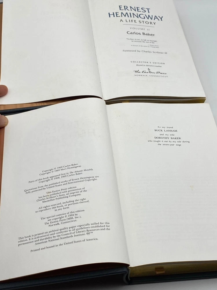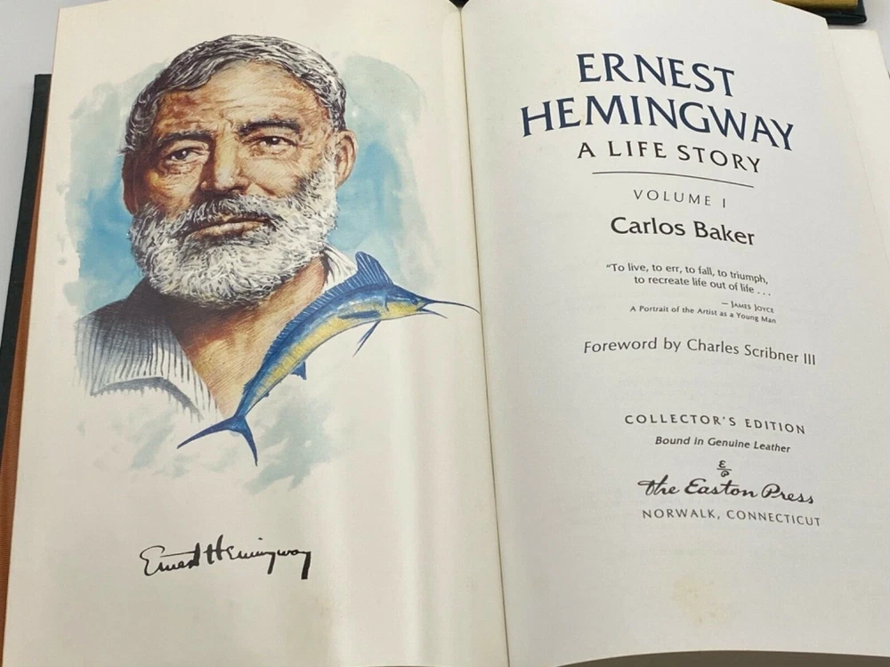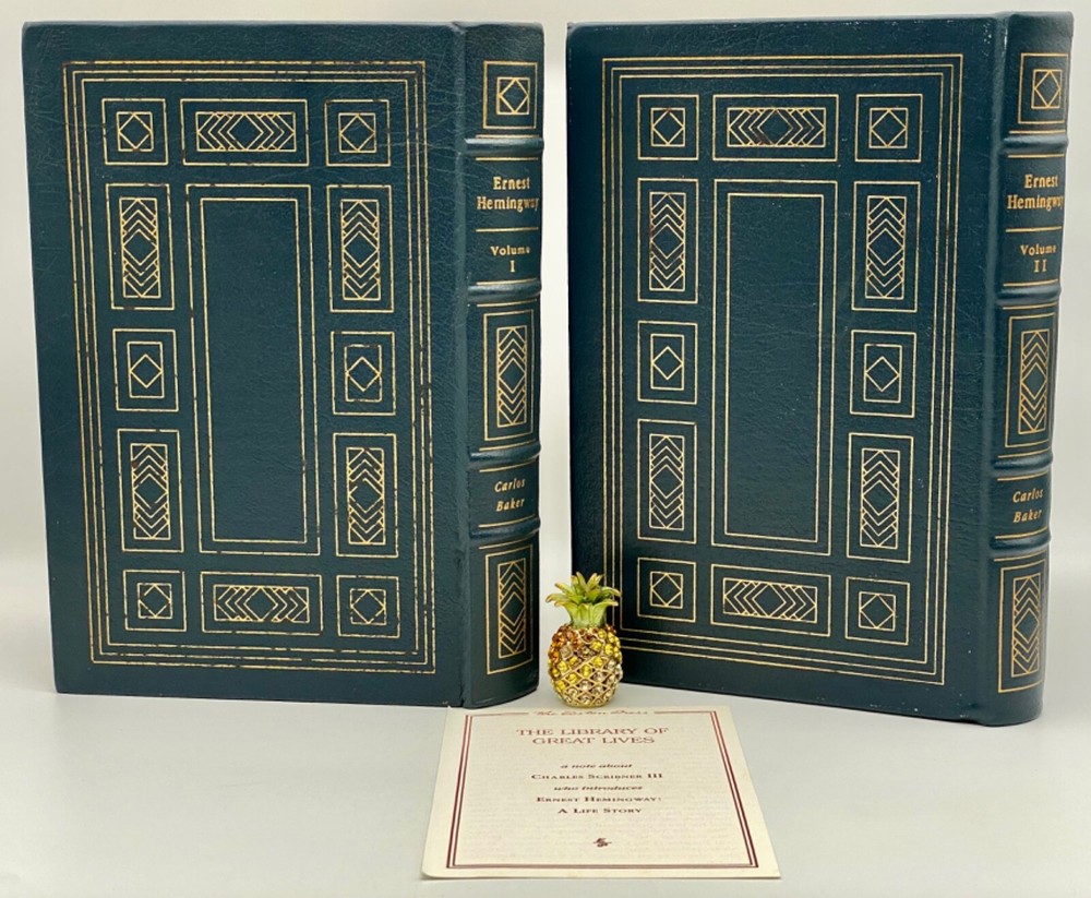 MAKES A GIFT FOR ANY HEMINGWAY FAN ** PLEASE READ : Mahalo for taking the time to look at our listing. We truly appreciate it. We always do our BEST to give you the most accurate description of these beautiful books. If, however, you have any SPECIFIC questions about the SIZE of the book, NUMBER of pages, TYPE of leather, SMELL or FEEL of the book, PLEASE email us through EBay’s mail system BEFORE you bid, and we will be HAPPY to give you more information. We want you to be completely happy with your purchase and keep you as our customers for years to come!** DESCRIPTION: Easton Press’s long out of print 2-VOLUME edition of the biography of ERNEST HEMINGWAY. THIS IS A SCARCE VINTAGE HEIRLOOM EASTON WITH LAVISH GILT IMPRESSIONS TO THE BOARDS AND SPINE. IT IS ONE OF THE MOST HIGHLY-PRIZED EDITIONS OF THIS BEST BIOGRAPHY OF ERNEST HEMINGWAY. COLLECTOR’S CARD IS INCLUCED. 🍍 NOT INCLUDED… 😃 ABOUT THE BOOK: Now hailed as a classic, Carlos Baker's bestselling biography of Hemingway brings into sharp focus one of the titans of 20th-century American literature, a writer whose life itself was the stuff of legend. CONDITION: Books are in BEAUTIFUL condition for their age with some fades to the gilt on the boards, and some age spots to the gilt page ends and first and last couple of pages of each book (SEE PICS FOR FURTHER DETAILS). NO ATTACHED BOOKPLATES, WRITING FROM PREVIOUS OWNER, ETC. It is truly a SPECTACULAR EDITION. SHIPPING: FREE TO US ADDRESSES ONLY. INTERNATIONAL $ based on location. WE SHIP PRIORITY MAIL & PACK VERY WELL. Please check out our other listings of Easton Press, Franklin Library, Limited Editions Club, First Edition Library, Folio Society, Heritage Press, and International Collectors Library editions. WE DO COMBINE SHIPPING IF YOU PURCHASE MORE THAN ONE COPY. Mahalo for looking at our listings! By bidding/purchasing this item, you are helping a very grateful family who sends you our WARMEST ALOHA & MAHALO!