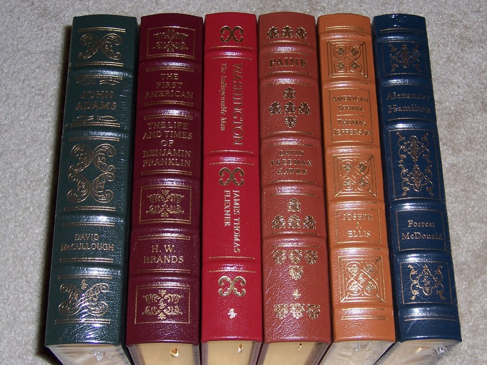 the definitive single-volume biographies of the men who created America's ideals Easton Press FOUNDING FATHERS in six volumes by various authors multi-color binding, matching sizes with frontispiece art works of Founding Father's portrait BOUND IN GENUINE LEATHER Copyright by Easton Press Hubbed Spine, Bound in Premium Full Leather Distinctive Cover Design, Profusely Illustrated Moire Endleaves, Satin Ribbon Page Marker Accented in Real 22KT Gold, Gilt Page Edges Smyth-sewn Pages for Strength and Durability Long-lasting, High Quality Acid-neutral Paper LIST OF TITLES: complete in six volumes: John Adams, by David McCullough American Sphinx: The Character of Thomas Jefferson, by Joseph J Ellis The First American: The Life and Times of Benjamin Franklin, by H W Brands Washington: The Indispensable Man, by James Thomas Flexner Alexander Hamilton: A Biography, by Forrest McDonald Paine, by David Freeman Hawke CONDITION DESCRIPTION: this set is in like new and unread condition: clean inside page, and binding is tight, beautiful bright endpapers and satin ribbon page marker. SHIPPING / HANDLING: The book will be shipped via USPS media mail with delivery confirmation, special care will be taken during packing to ensure you receive the books as described.