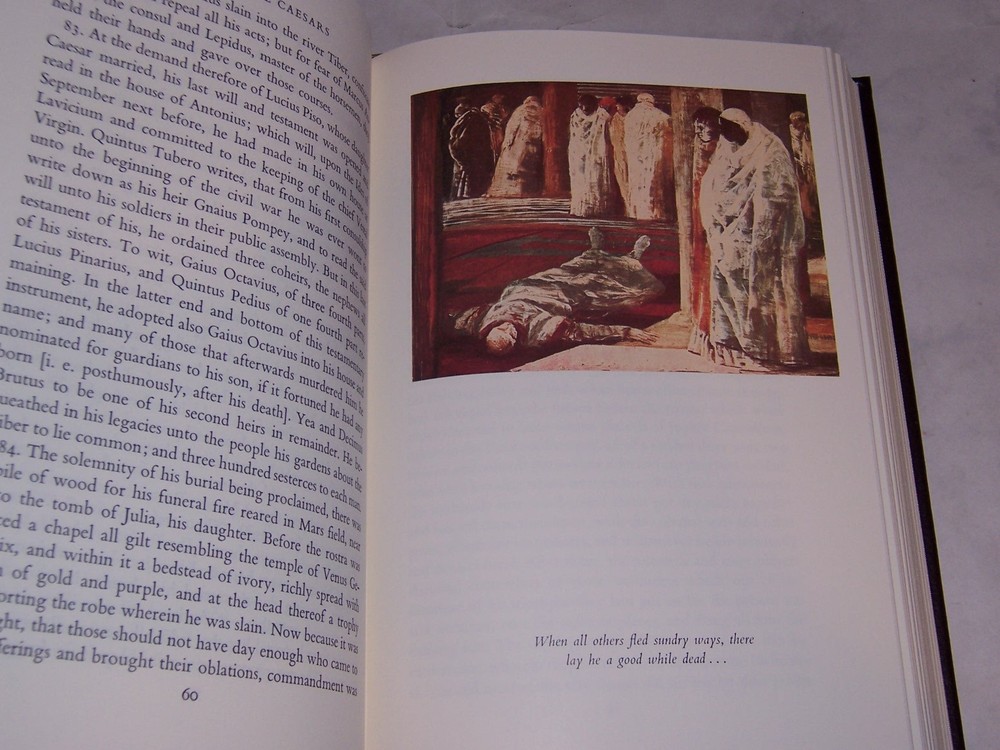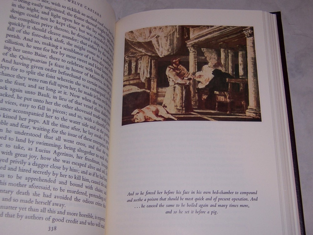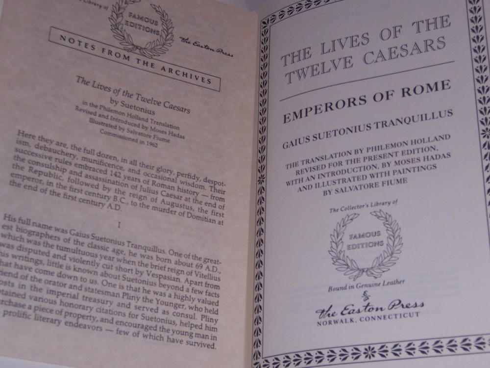 Collector's Library of Famous Editions Easton Press LIVES OF TWELVE CAESARS : Emperors of Rome by Gaius Suetonius Tranquillus, the translation by Philemon Holland, illustrated with the paintings by Salvatore Fiume Dark brown leather hardcover with unique design with Collector's Notes sheet do not miss this great deal Copyright by The Easton Press hubbed spine, bound in premium full leathers distinctive cover design, beautiful illustrations handsome, readable typefaces, permanent satin ribbon page marker elegant gilded page edges, endsheets of rich moire fabric thread-sewn pages for durability and strength, long-lasting high quality, acid-neutral paper CONDITION DESCRIPTION: Like new and unread condition, with unattached blank bookplate, shiny gold page edging, beautiful bright endleaves, and satin ribbon page marker. It is a very special books to be added to your personal collection. SHIPPING / HANDLING: Book(s) will be handled/packed very safely, and shipped via USPS media mail with delivery confirmation.