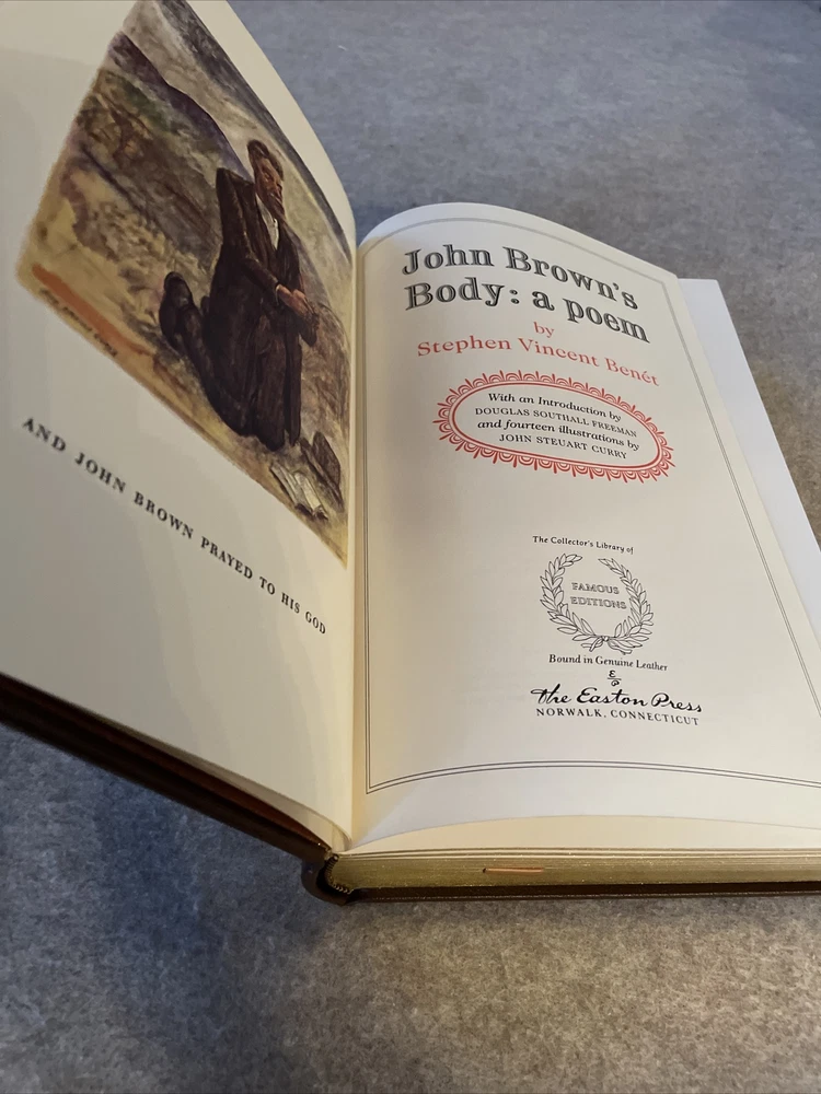 Easton Press Famous Editions John Brown's Body: A Poem by Stephen Vincent Benet There are no book plates in the book. This book is in near mint condition with no wear. The gold on the covers shows no wear. The end pages show no fading. The gilt on the edge of the pages is in almost perfect condition, with a light scratch on the bottom. Please see photos. We try to describe as accurately as possible so you will be satisfied with your purchase. We have more books from this set on eBay and we would be happy to combine on shipping to save you money. All books are sent with insurance via USPS Media Mail.