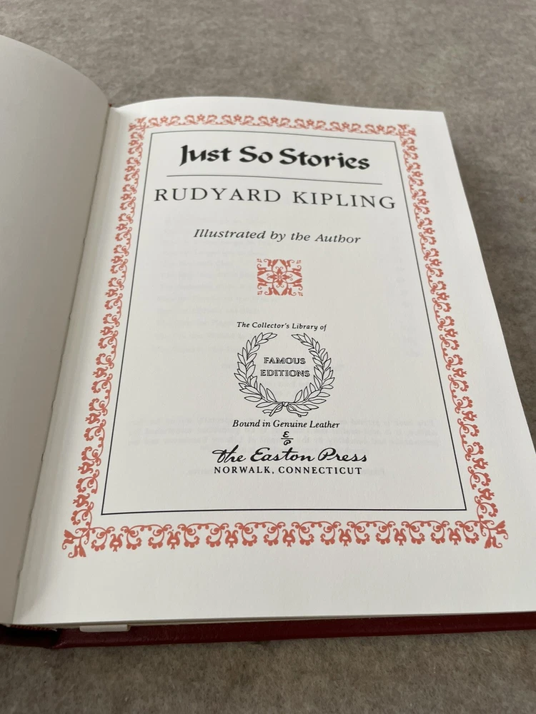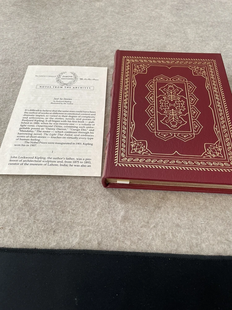 Easton Press Famous Editions Just So Stories by Rudyard Kipling There are no book plates in the book. It comes with the Famous Edition editor's notes. This book is in near mint condition with no wear. The gold on the covers shows no wear. The end pages show no fading. The gilt on the edge of the pages is in almost perfect condition, with a light scratch on the side and top. Please see photos. We try to describe as accurately as possible so you will be satisfied with your purchase. We have more books from this set on eBay and we would be happy to combine on shipping to save you money. All books are sent with insurance via USPS Media Mail.