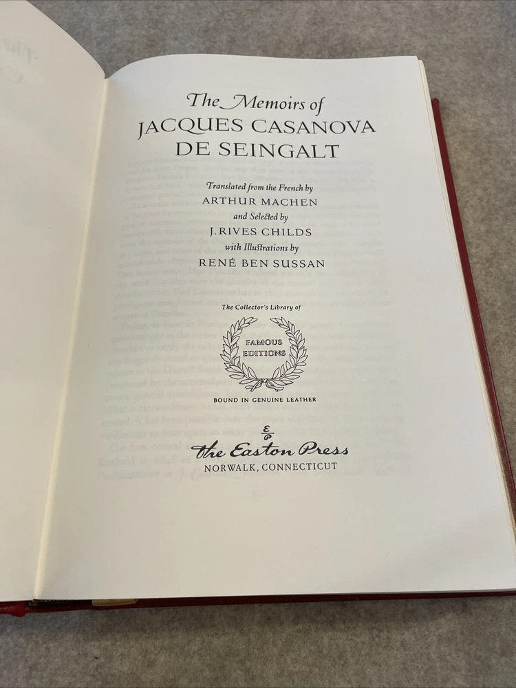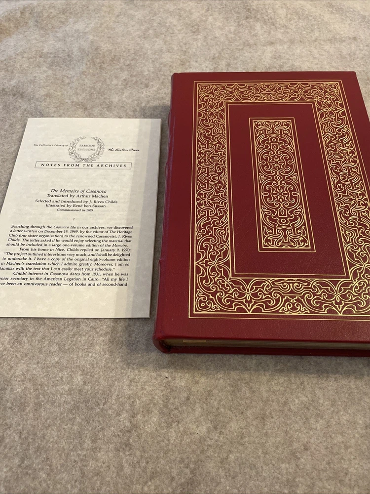 Easton Press Famous Editions Memoirs of Casanova, translated by Arthur Machen There are no book plates in the book. It comes with the Famous Edition editor's notes. This book is in near mint condition with no wear. The gold on the covers shows no wear. The end pages show no fading. The gilt on the edge of the pages is in almost perfect condition, with a light scratch on the side Please see photos. We try to describe as accurately as possible so you will be satisfied with your purchase. We have more books from this set on eBay and we would be happy to combine on shipping to save you money. All books are sent with insurance via USPS Media Mail.
