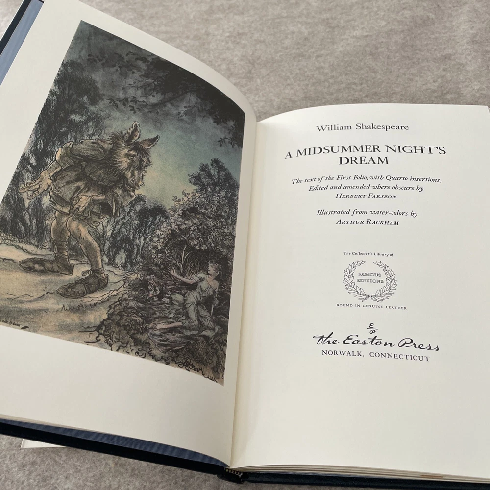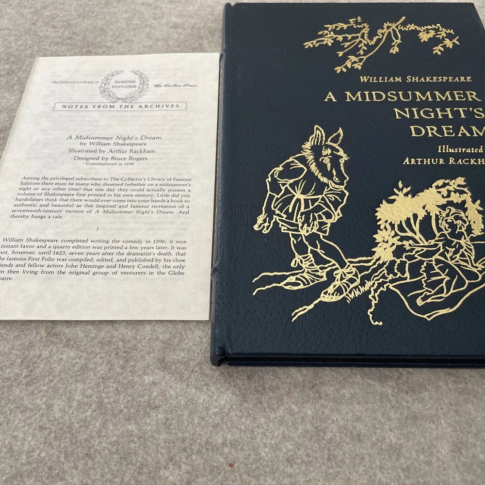 Easton Press Famous Editions A Midsummer Night's Dream by William Shakespeare There are no book plates in the book. It comes with the Famous Edition editor's notes. This book is in mint condition with no wear. The gold on the covers shows no wear. The end pages show no fading. The gilt on the edge of the pages is in perfect condition. Please see photos. We try to describe as accurately as possible so you will be satisfied with your purchase. We have more books from this set on eBay and we would be happy to combine on shipping to save you money. All books are sent with insurance via USPS Media Mail.