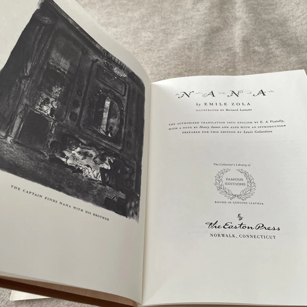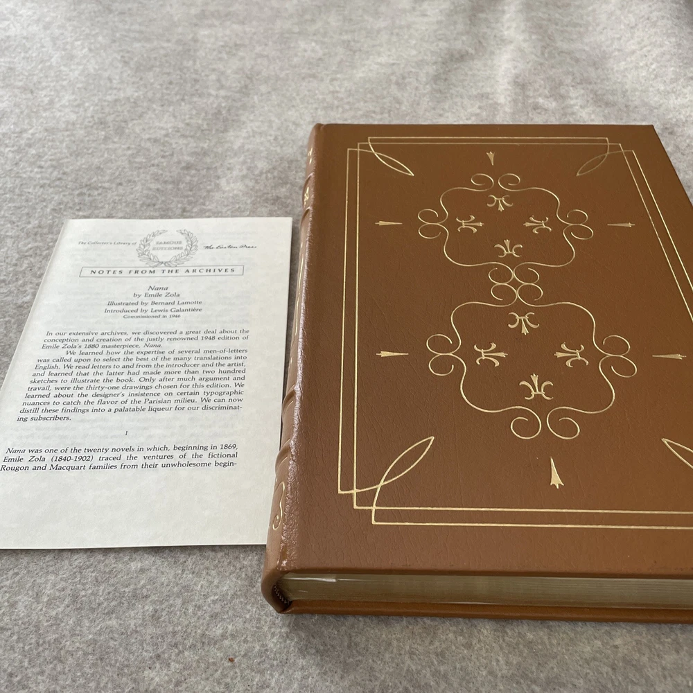 Easton Press Famous Editions Nana by Emile Zola There are no book plates in the book. It comes with the Famous Edition editor's notes. This book is in mint condition with no wear. The gold on the covers shows no wear. The end pages show no fading. The gilt on the edge of the pages is in perfect condition. Please see photos. We try to describe as accurately as possible so you will be satisfied with your purchase. We have more books from this set on eBay and we would be happy to combine on shipping to save you money. All books are sent with insurance via USPS Media Mail.