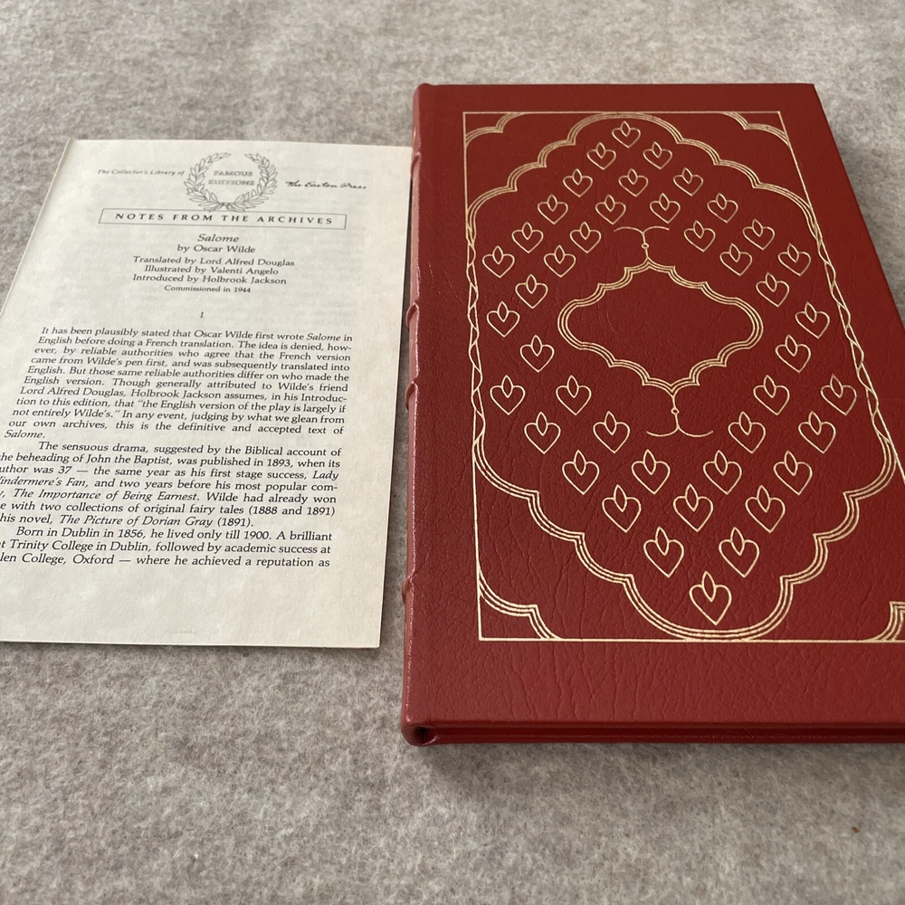 Easton Press Famous Editions Salome by Oscar Wilde There are no book plates in the book. It comes with the Famous Edition editor's notes. This book is in mint condition with no wear. The gold on the covers shows no wear. The end pages show no fading. The gilt on the edge of the pages is in perfect condition. Please see photos. We try to describe as accurately as possible so you will be satisfied with your purchase. We have more books from this set on eBay and we would be happy to combine on shipping to save you money. All books are sent with insurance via USPS Media Mail.