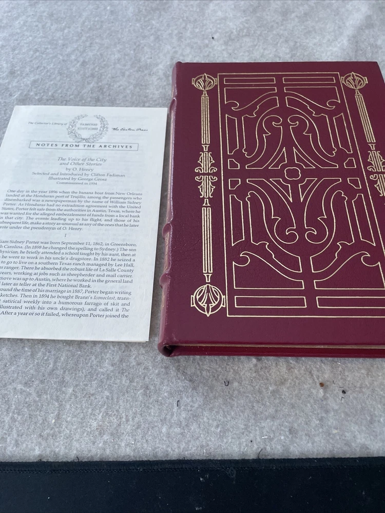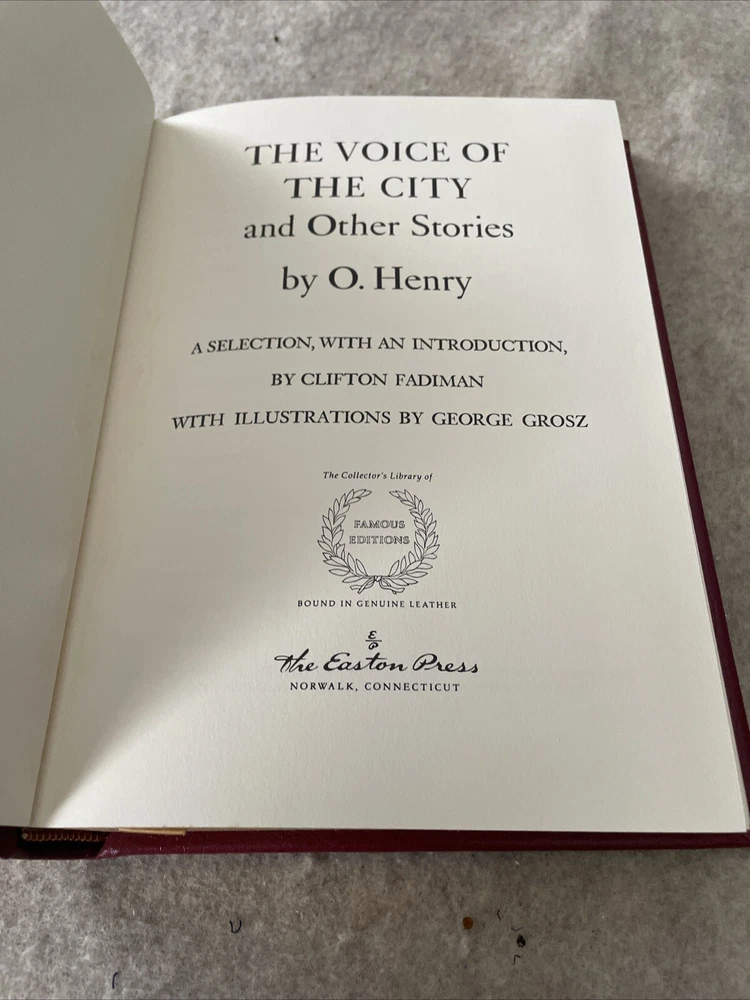 Easton Press Famous Editions The Voice of the City and Other Stories by O. Henry There are no book plates in the book. It comes with the Famous Edition editor's notes. This book is in near mint condition with no wear. The gold on the covers shows no wear. The end pages show no fading. The gilt on the edge of the pages is in very good condition with spotting on the bottom and side. Please see photos. We try to describe as accurately as possible so you will be satisfied with your purchase. We have more books from this set on eBay and we would be happy to combine on shipping to save you money. All books are sent with insurance via USPS Media Mail.